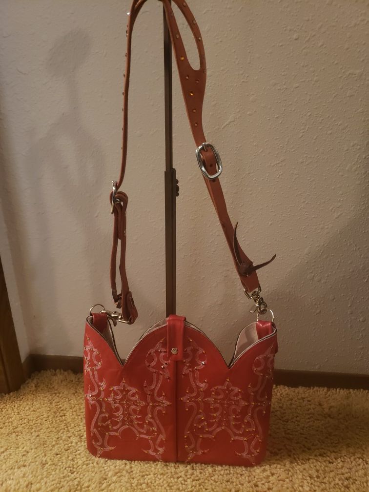 Blinged and made from leather boot shafts. Hand crafted. Sworwaski crystals. Red and blue are 12 inches wide and 10 inches tall, the baby blue is 6 wide and 9 tall. Red with halter blinged strap is 150.00 the blue with cow hide strap is 125.00 and the baby blue is 100.00.