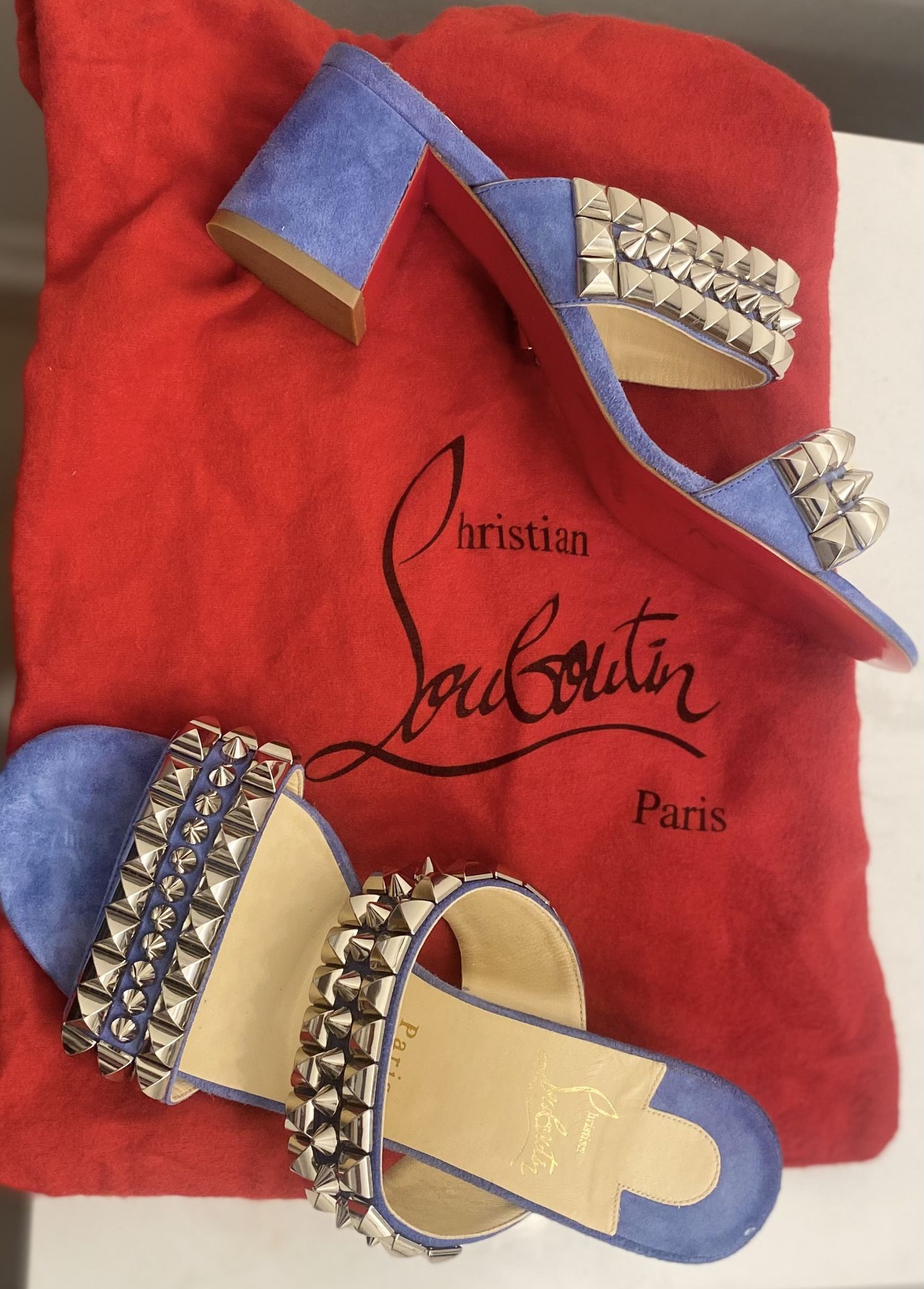 Authentic Christian Louboutin Tina Goes Mad 55 sandals. Blue suede with silver spike studs. Size EU 38 (US 7.5–8). Very good condition with light wear on soles. Includes original dust bag. Retail around $900+.