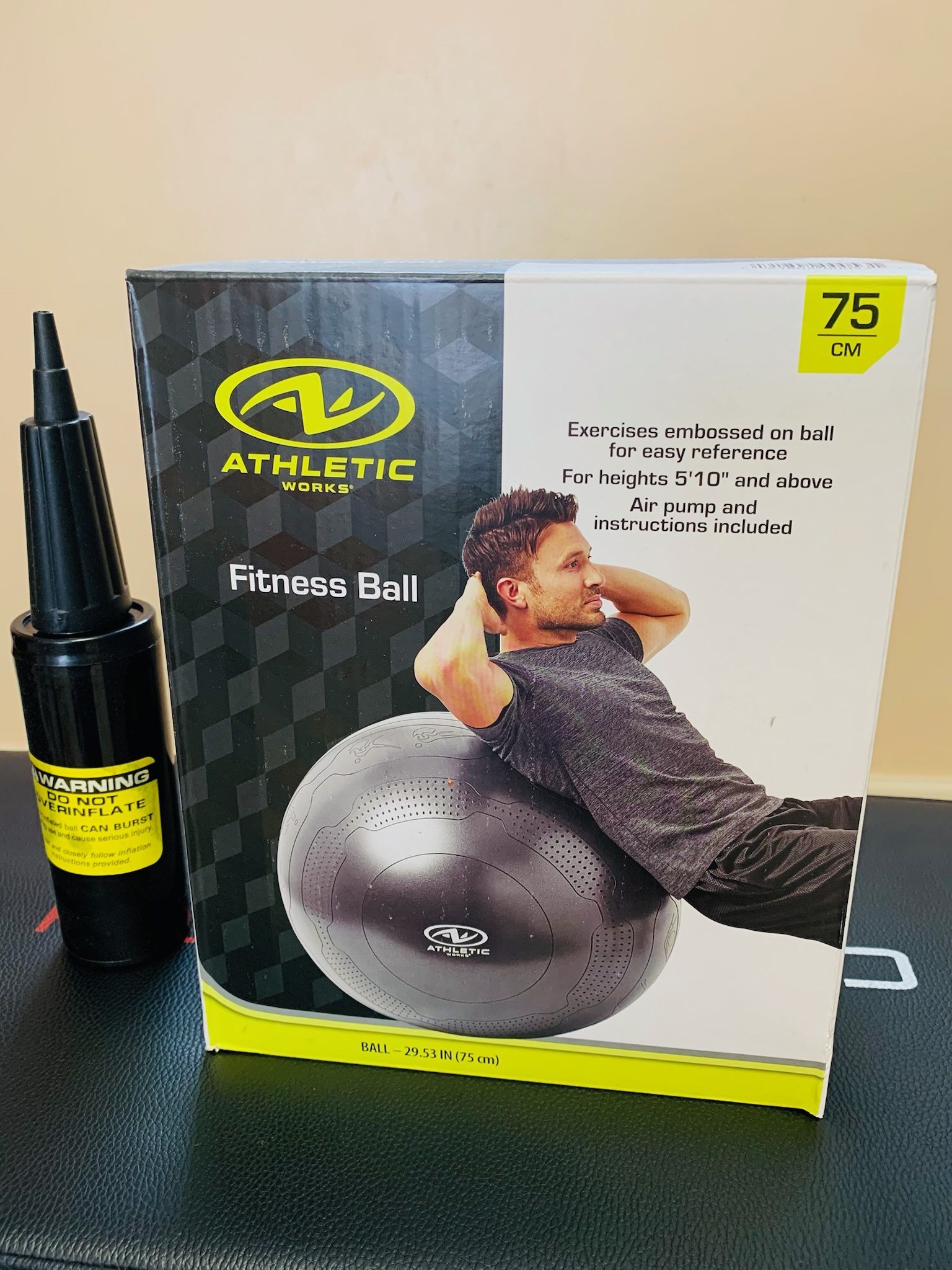 New in box, never opened 75cm gray exercise ball with an extra air pump.