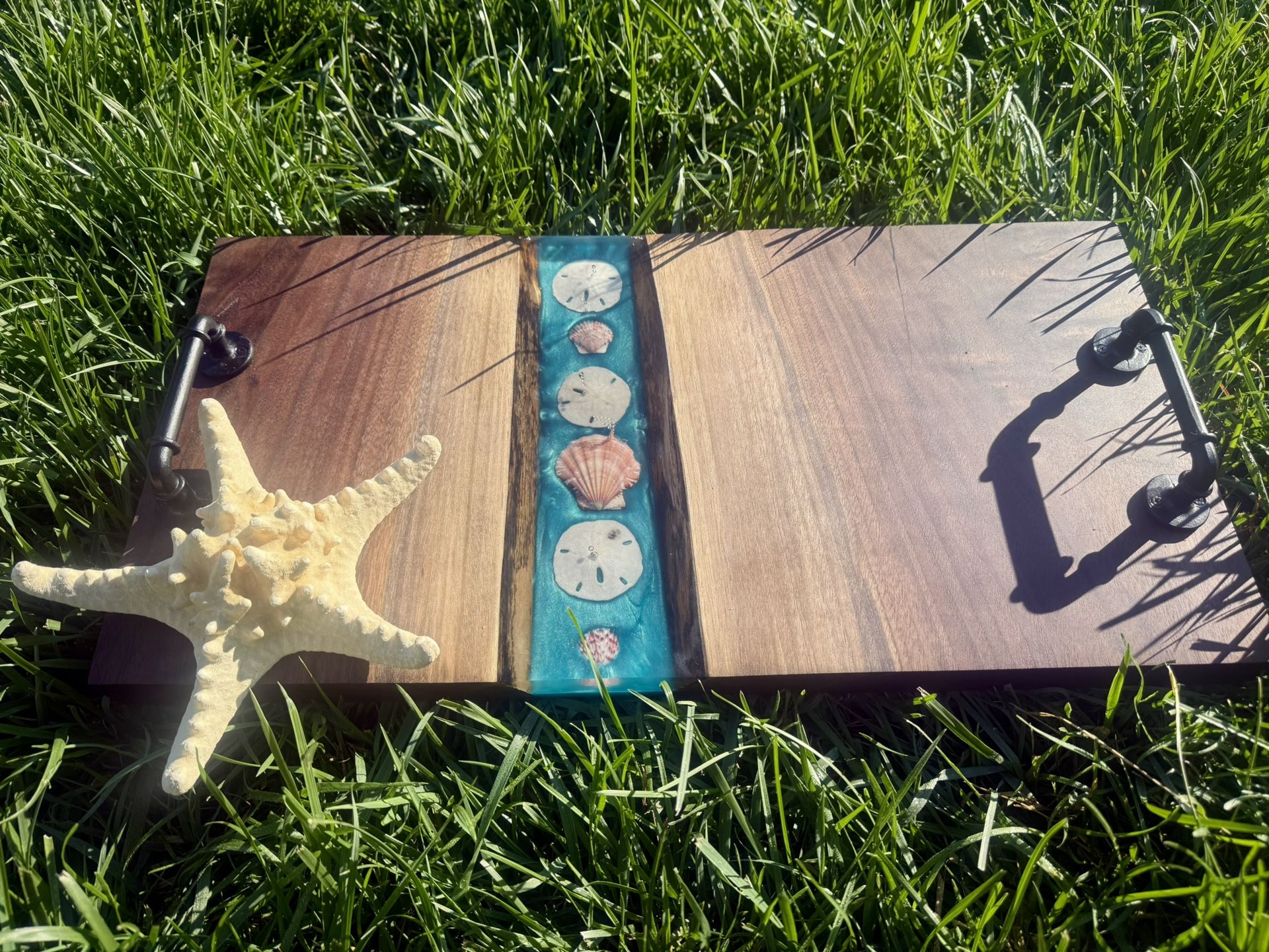 Custom hand made ocean themed charcuterie board with real sand dollars and sea shells inside. Two layers of epoxy blue layer then a clear layer put in between two pieces of black walnut. Finished with and made food grade with odies oil. (The starfish is not included). 22 1/8x 11 1/4x 1 3/8 Price is obo Will ship but buyer pays shipping