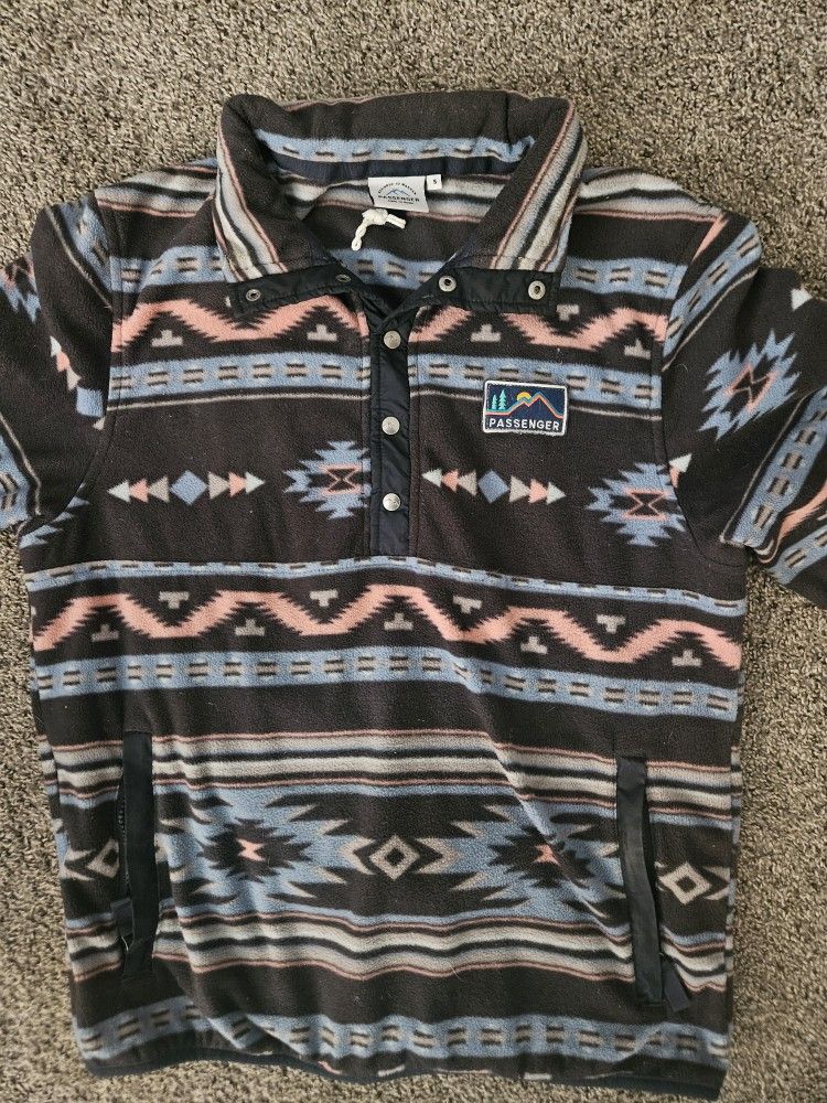 Passenger fleece pullover with Southwestern / Aztec pattern. Cozy mid-weight fleece with snap button front, kangaroo pockets, and embroidered Passenger logo patch. Size: Small Condition: Very good – no holes, stains, or damage. Light normal wear only. Perfect for hiking, camping, festivals, road trips, or everyday cozy wear. Popular REI-core and boho outdoor style. Shipping or local pickup available.