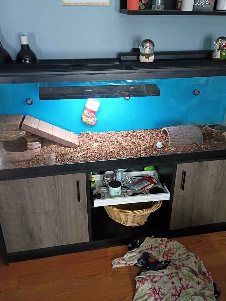 120 gallon tank with stand has lid, zoo med sun lamp, heat lamp and ceramic lamp and an extra light Best offer