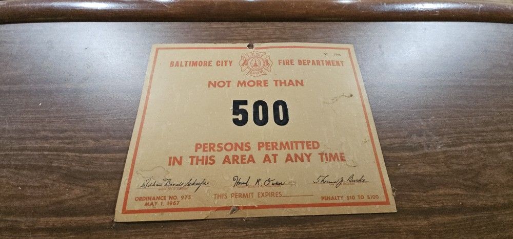 1967 Baltimore City Fire Dept Occupancy Permit - Vintage / Original