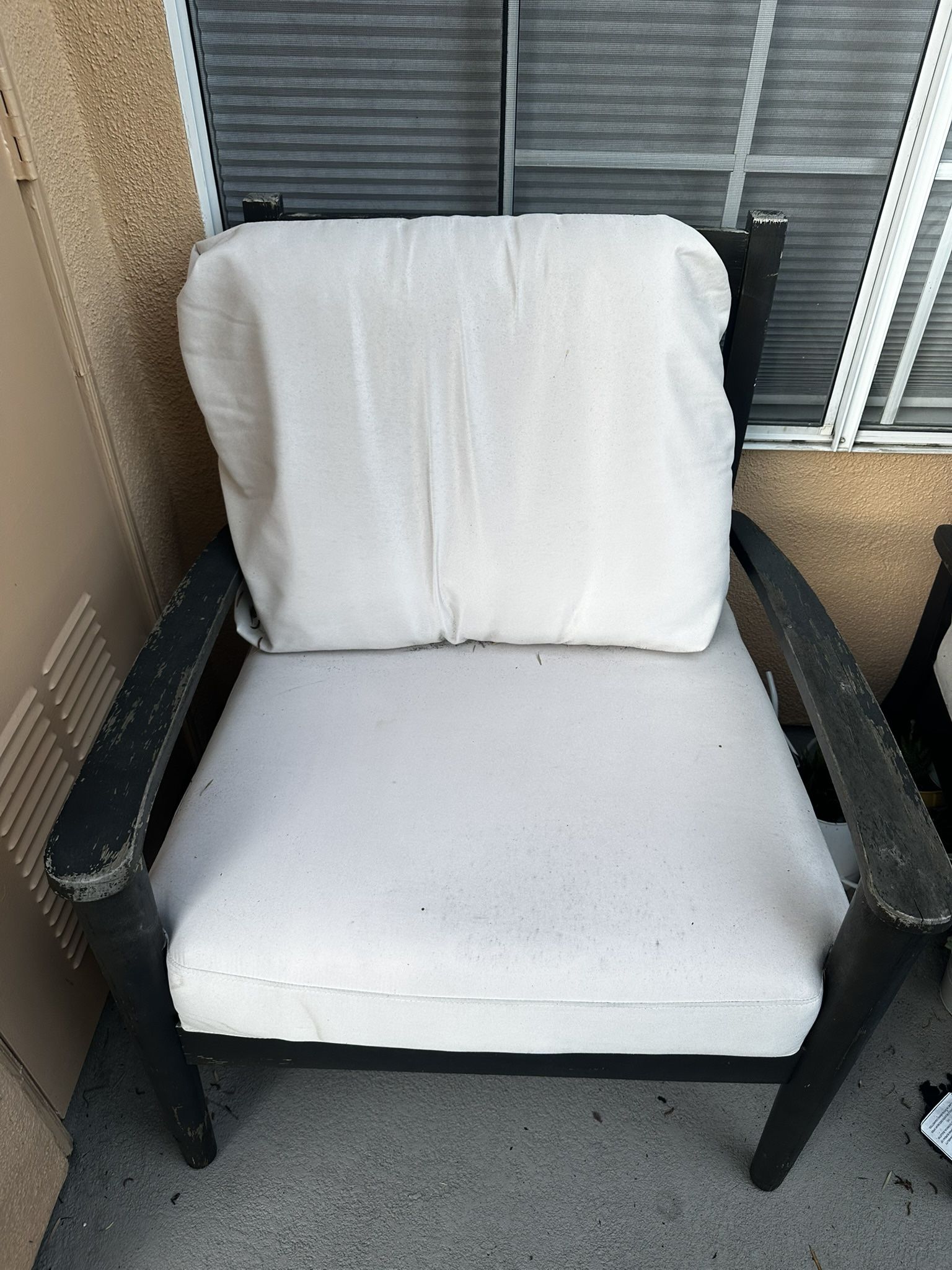 Set of comfortable outdoor patio lounge chairs with thick cushions. Sturdy wood frame and deep seating. About 1 year old. Normal outdoor wear on the arms and light marks on cushions, priced accordingly. No structural issues, very solid and comfortable. Great for patio, balcony, or backyard. $120 for the pair OBO. Pickup only.