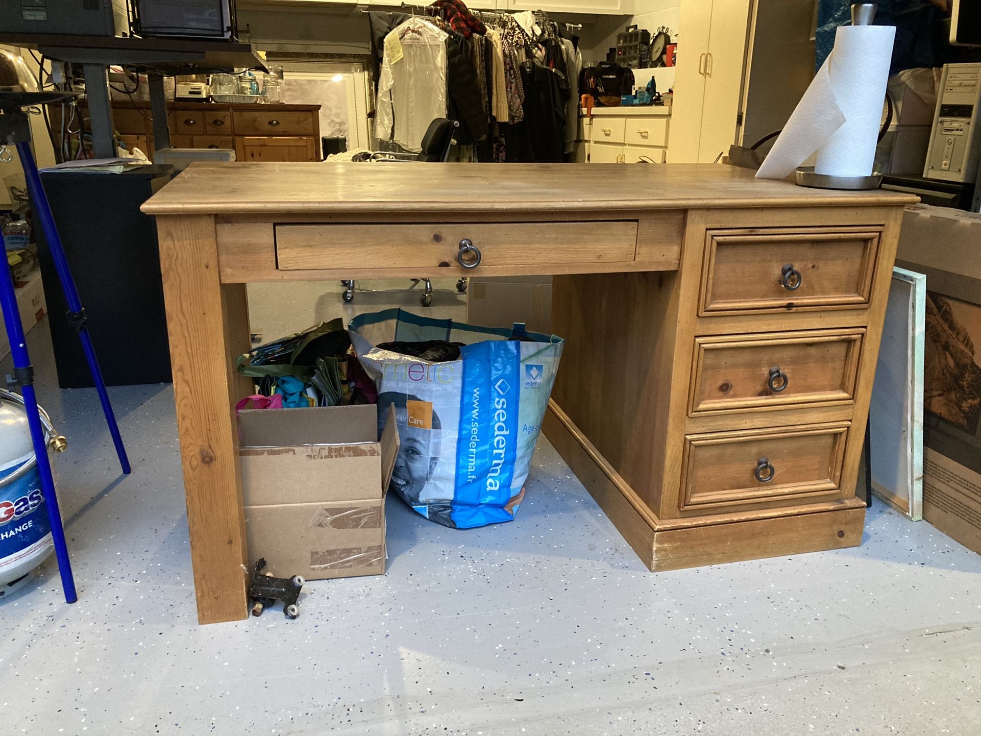 Selling my farmhouse style desk that I purchased over 2 decades ago. It has served its purpose as a high quality desk that will outlast any modern day desk of today. This piece was a custom made order and has withstood the test of time. All it needs is a surface refresh and it’s as good as new. All drawers open and close flawlessly and is sturdy like the day I bought it.
