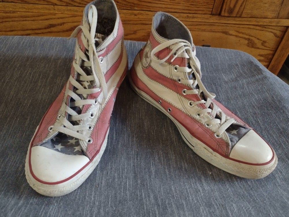 1) Stars & Stripes, red white & blue, high tops, Very good condition, m13, w15. 2) Black high top one star, m13, good Condition, 3) Red low top, one star, m13, Good condition, 4) Gray low top, all stars, m13, w15. Old, good condition. 5) Gray low top, slip on, all stars, m13, w15. New condition. 6) Black, low top, all stars, Chuck Taylors, M13, w15, very good condition, Check out my other Converse posts. Chuck Taylor.