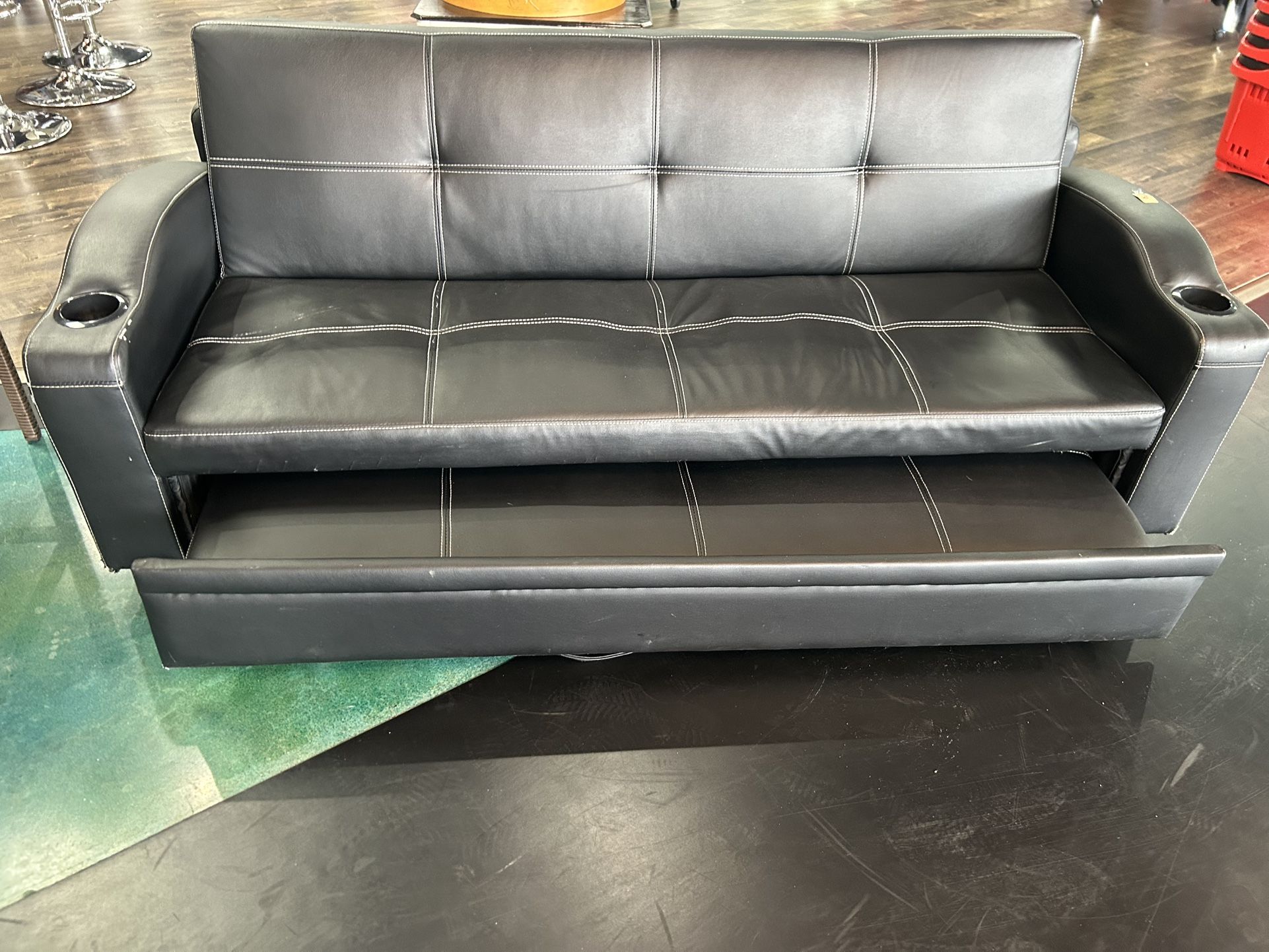 Length 7ft width 34” Height 34” The sofa has a trunnion that pulls out the back rest of the sofa will lay out to make a futon. Has a few minor marks on the sofa, but overall is in good condition Available at the 2nd Chance store 1000 E Route 66 Unit F Glendora ca Open Tuesday through Saturday 10 AM through 5 PM