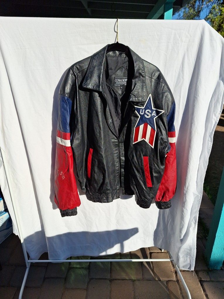 COSA NOVA Black with red white and blue sleeves. The back has bold letters USA in white and the American flag. Size XL left inner pocket present. Light weight. Good zippers with snaps closures next to top and bottom. A rare find