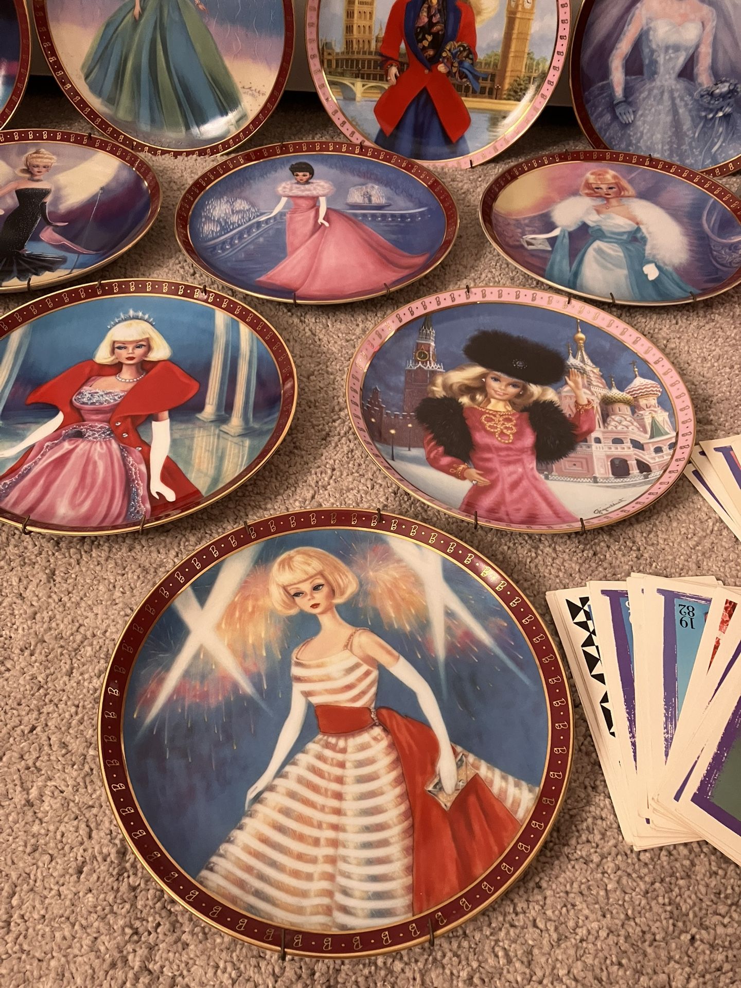Complete Set of 10 Barbie collection plates from Danbury mint. These plates were by subscription only and all plates carry the same H1830 subscription number and all plates have wall hanging brackets on. Included is a 35th anniversary Barbie doll and approximately 80 Barbie collector fashion cards. No reasonable offer refused and serious buyers only please