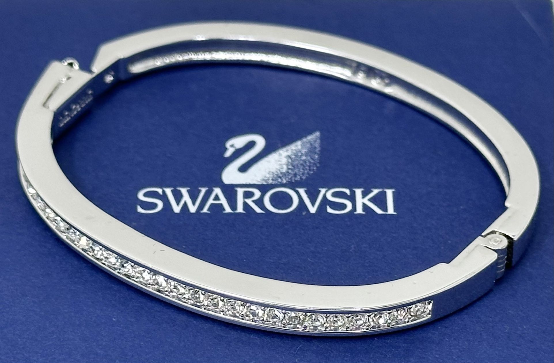 Includes Swarovski Bangle Swarovski Box - Details Swarovski Swarovski Crystals Swan stamp inside Rhodium Plated Hinged Oval Bangle Approx. 5mm wide Fits up a 6.75" wrist - Good cosmetic condition - Some minor wear may have been difficult to capture in pictures - Has some scratches, scuffs, marks, dust, dirt, etc. - Professional clean and polish recommended - All items on our site are pre-owned, regardless of condition (new, used, or for parts). - High-value items may require signature confirmation upon delivery. - Wear refers to normal damage or aging from regular use. - C1 - I44-7648-AE