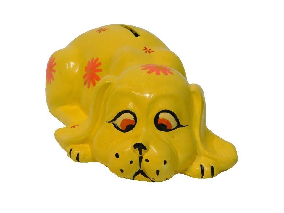 Vintage Retro EW Japan Ceramic 9" Yellow Laying Dog Puppy Bank Flower Plug 1960 $15 Shipping always available. Bright yellow pink flowered vintage retro 60's era dog bank, brown eye's with black outline, long ears flow down puffy cheeks. Minor paint chips on bottom from where he was lifted off the paint platform kiln, refer to pictures. Comes with plug that is a tad loose. Well potty trained, needs a home. Approximately 9"x5"x4" Well potty trained, needs a home.