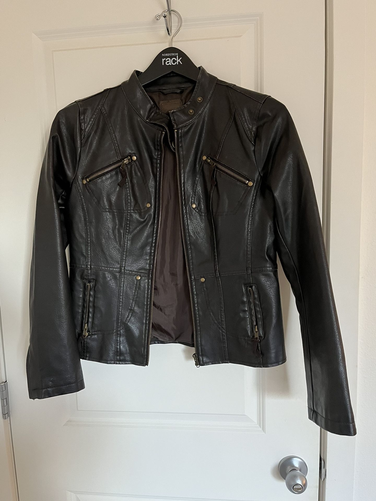 Faux Leather Biker Jacket For Women Size Medium. Great conditions. Zipper on both sleeves. Free smoke and free pet home.