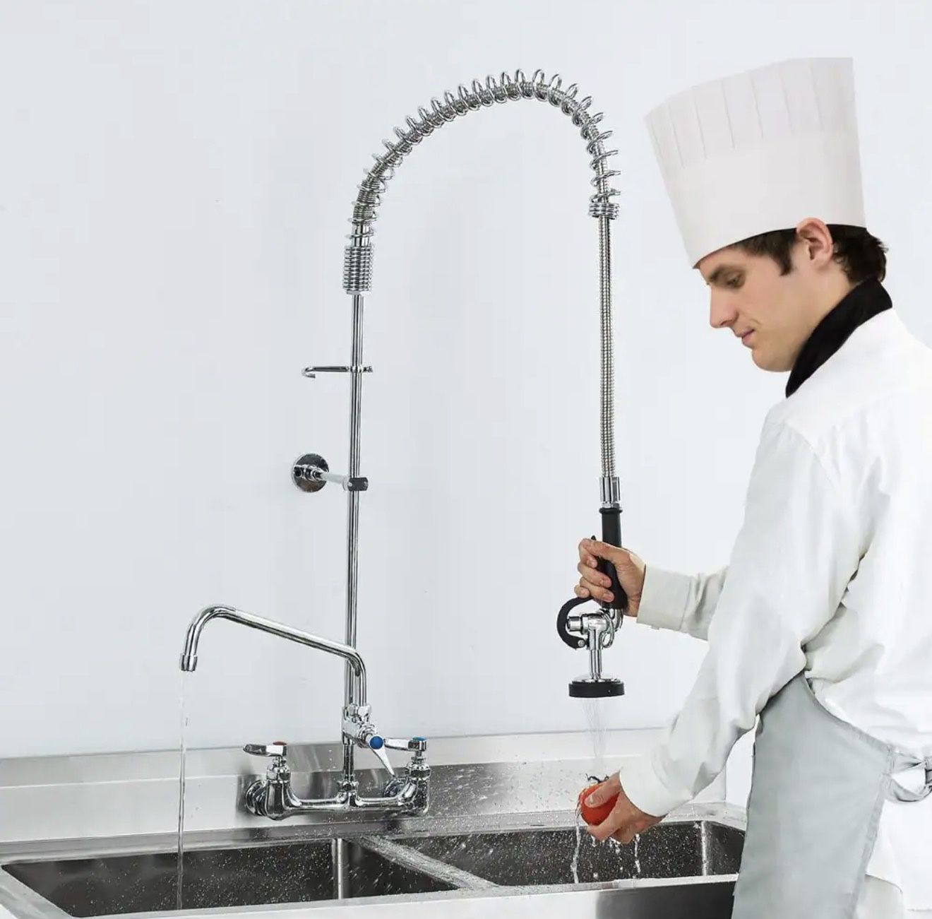 New - in box still #5136 *Pick up only* SKYSHALO Commercial Faucet with Pre-Rinse Sprayer 47 in. Height 8 in. Center 12 in. Swing Spout Wall Mount Kitchen Sink Faucet
