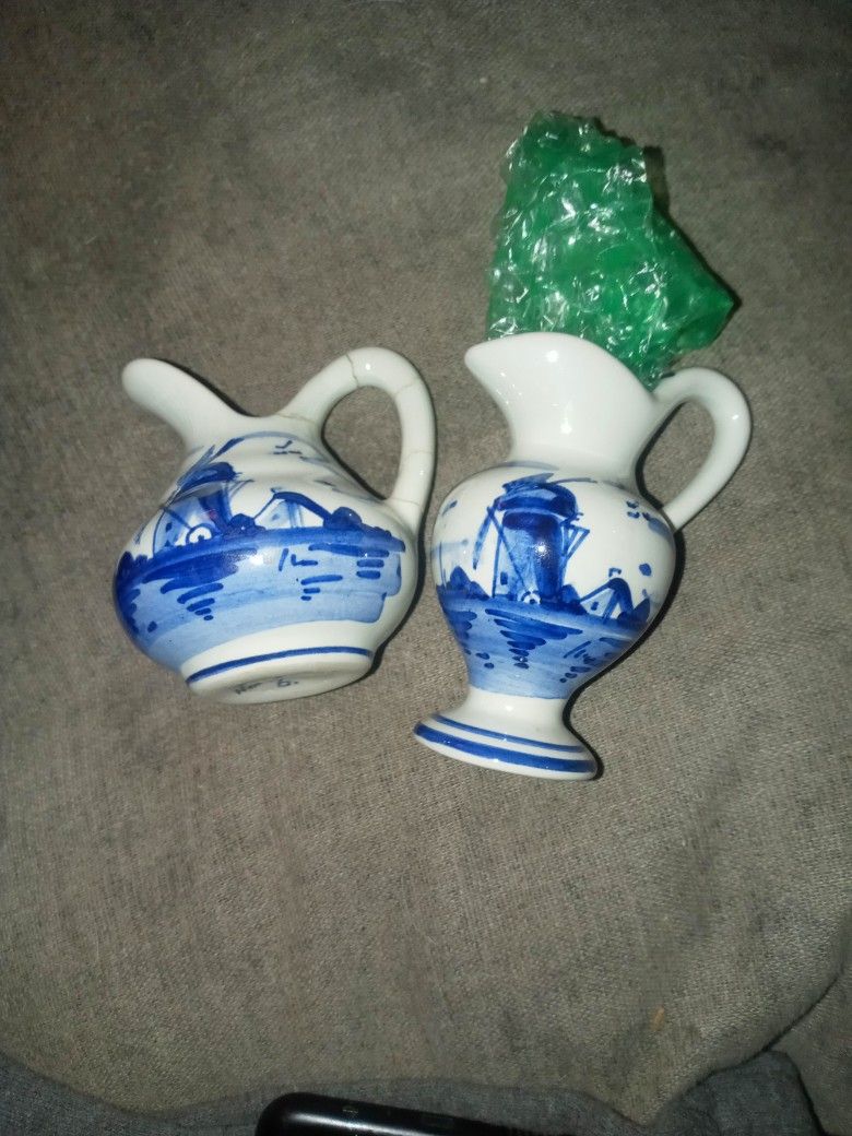 2 Vintage Miniature Delft's Blue Pitchers Blauw Holland Hand Painted Vases Delft