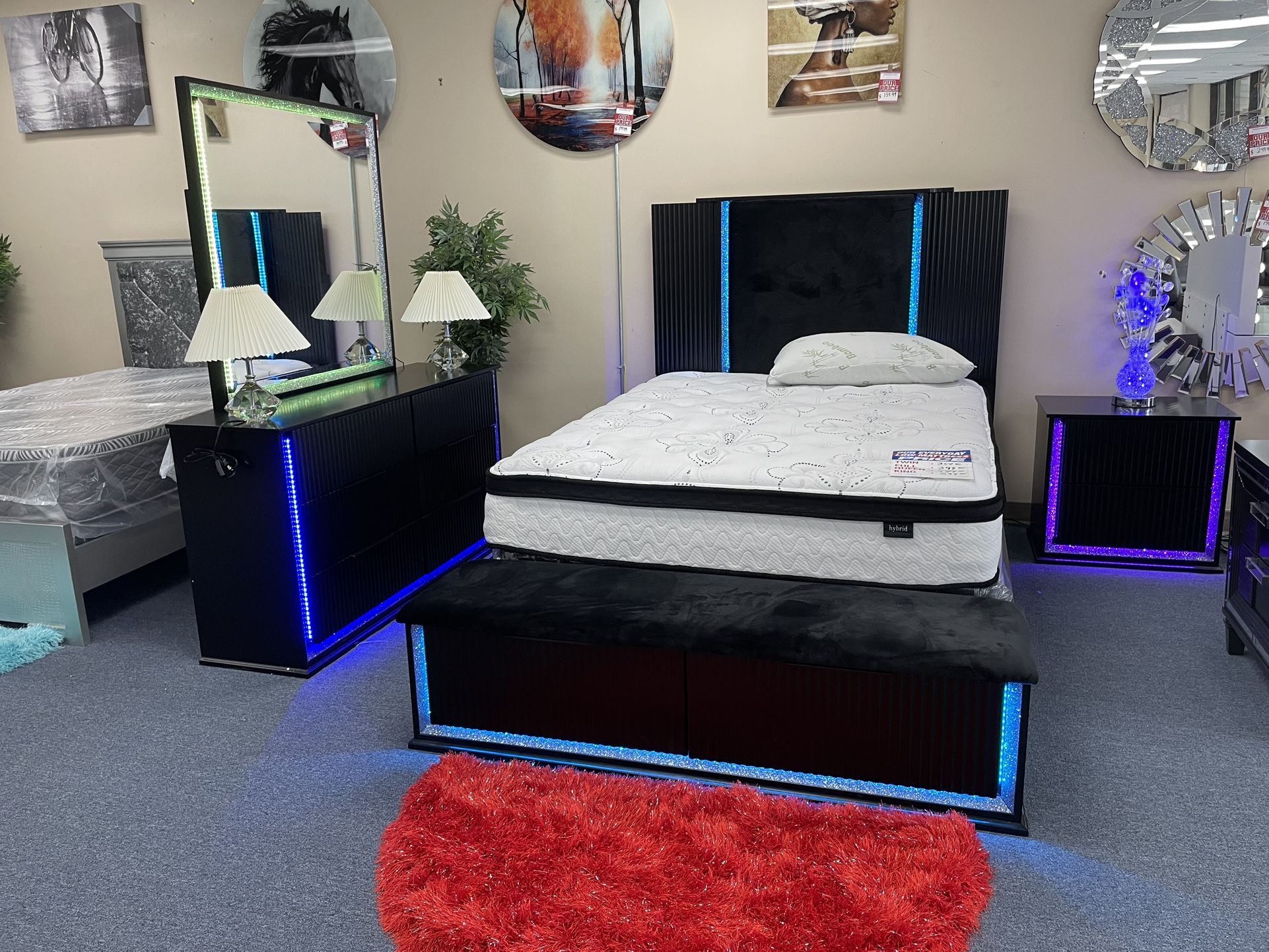 Queen bed, dresser, mirror, nightstand with lights included