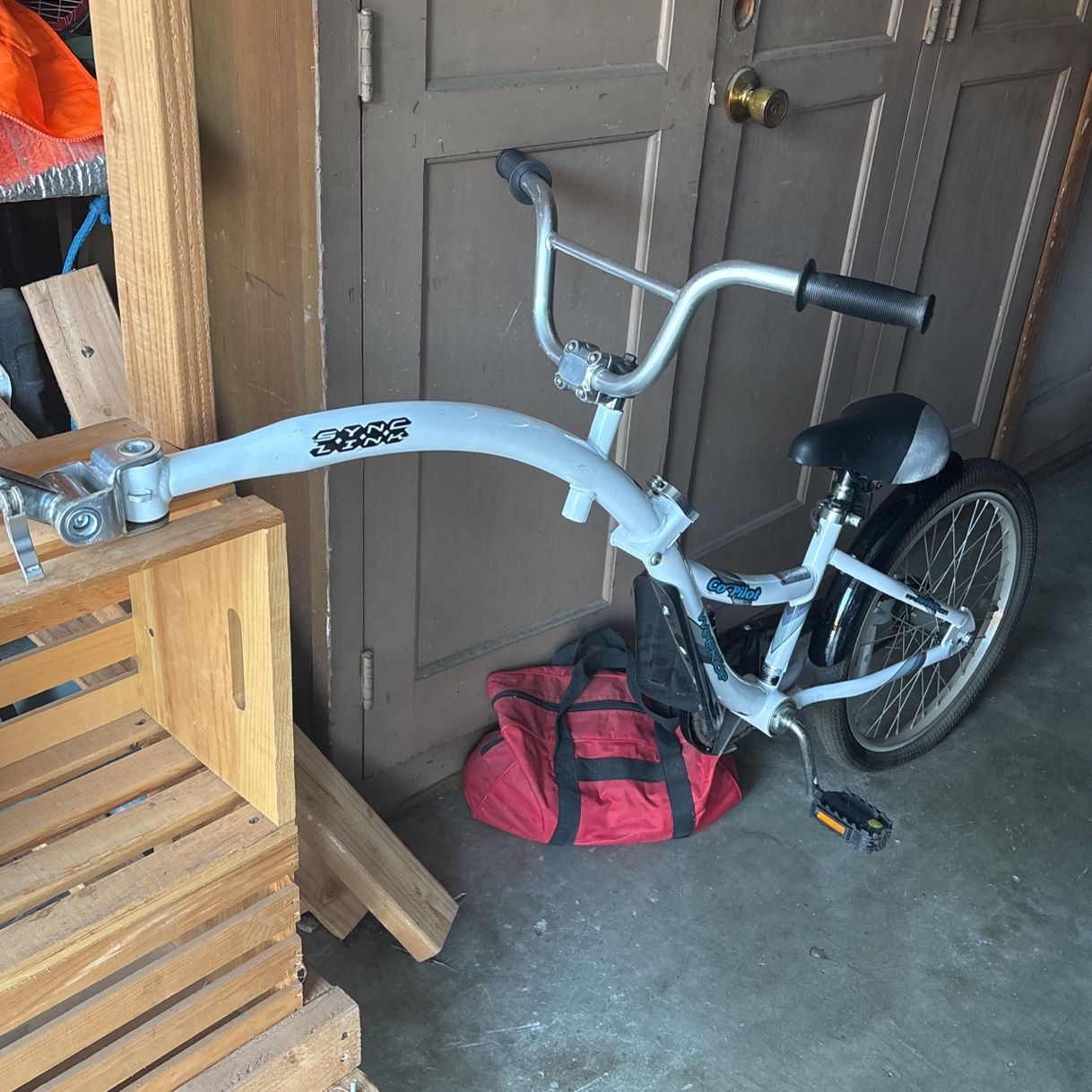 Used 1x. Wee bike attaches to adult bike like a trailer to teach kids to ride bike. All attachments included.