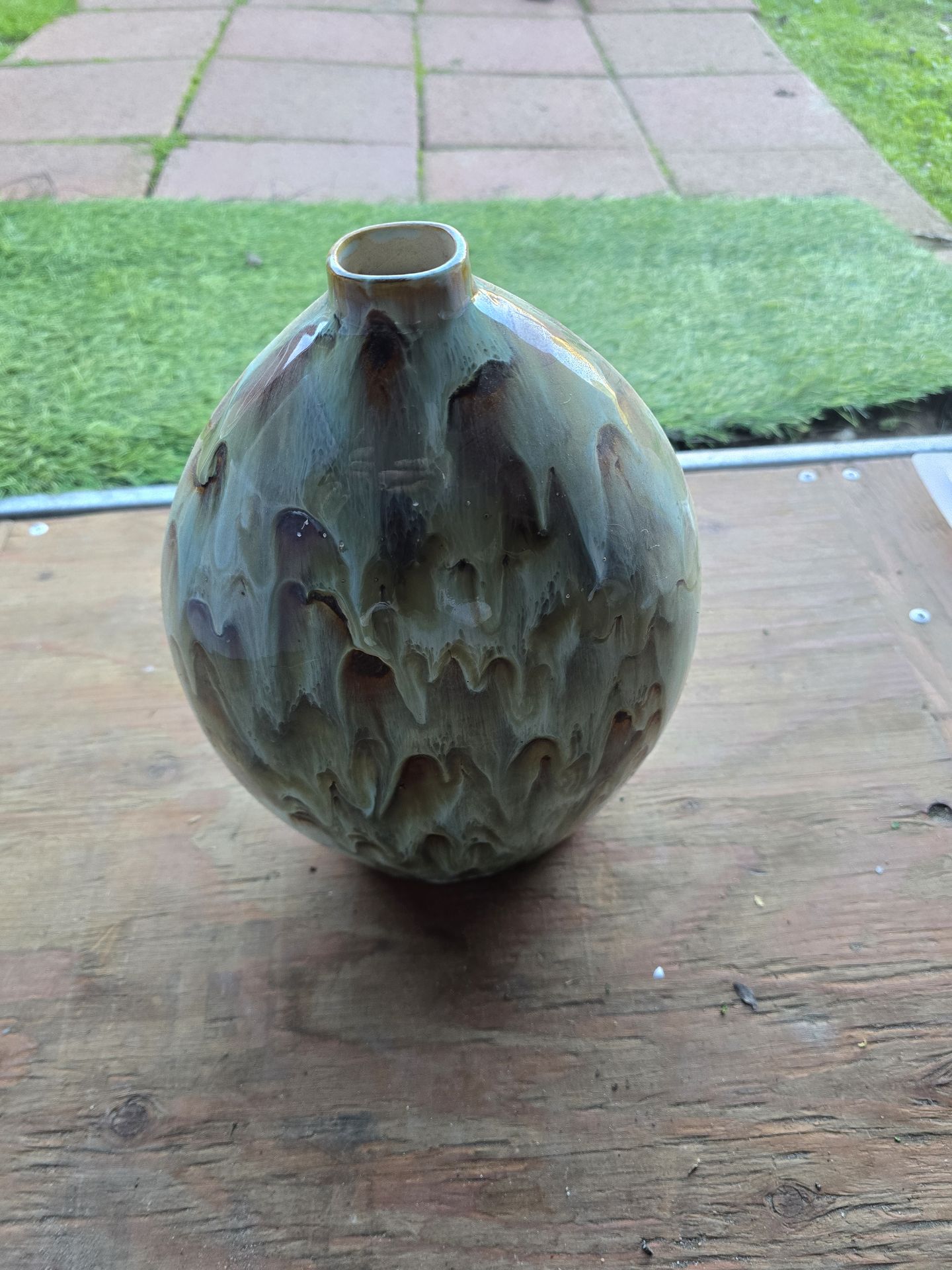 This item is a handcrafted green drip glaze ceramic bottle vase, similar to artisan pottery . Style: Organic, drip-glaze aesthetic with flowing colors. Material: Ceramic stoneware. Color Palette: Dominated by shades of green with brown or dark metallic accents. Function: Decorative home accent or art piece.