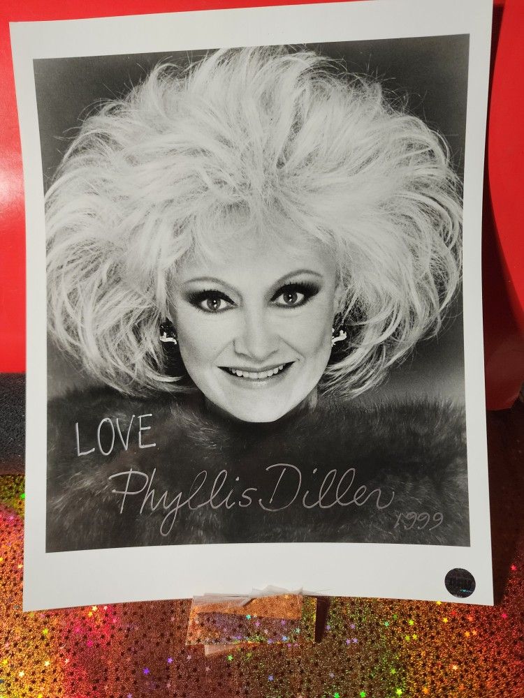 This image shows an autographed black and white photo of the legendary American comedian and actress Phyllis Diller. The inscription "LOVE Phyllis Diller 1999 a pioneering female stand-up comedian known for her self-deprecating humor and eccentric stage persona.