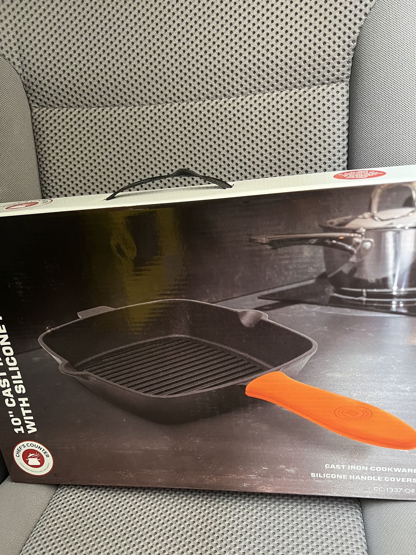 Chef’s Counter 10 Inch Square Cast Iron Grill pan with Silicone Handle. Silicone handle is removable.