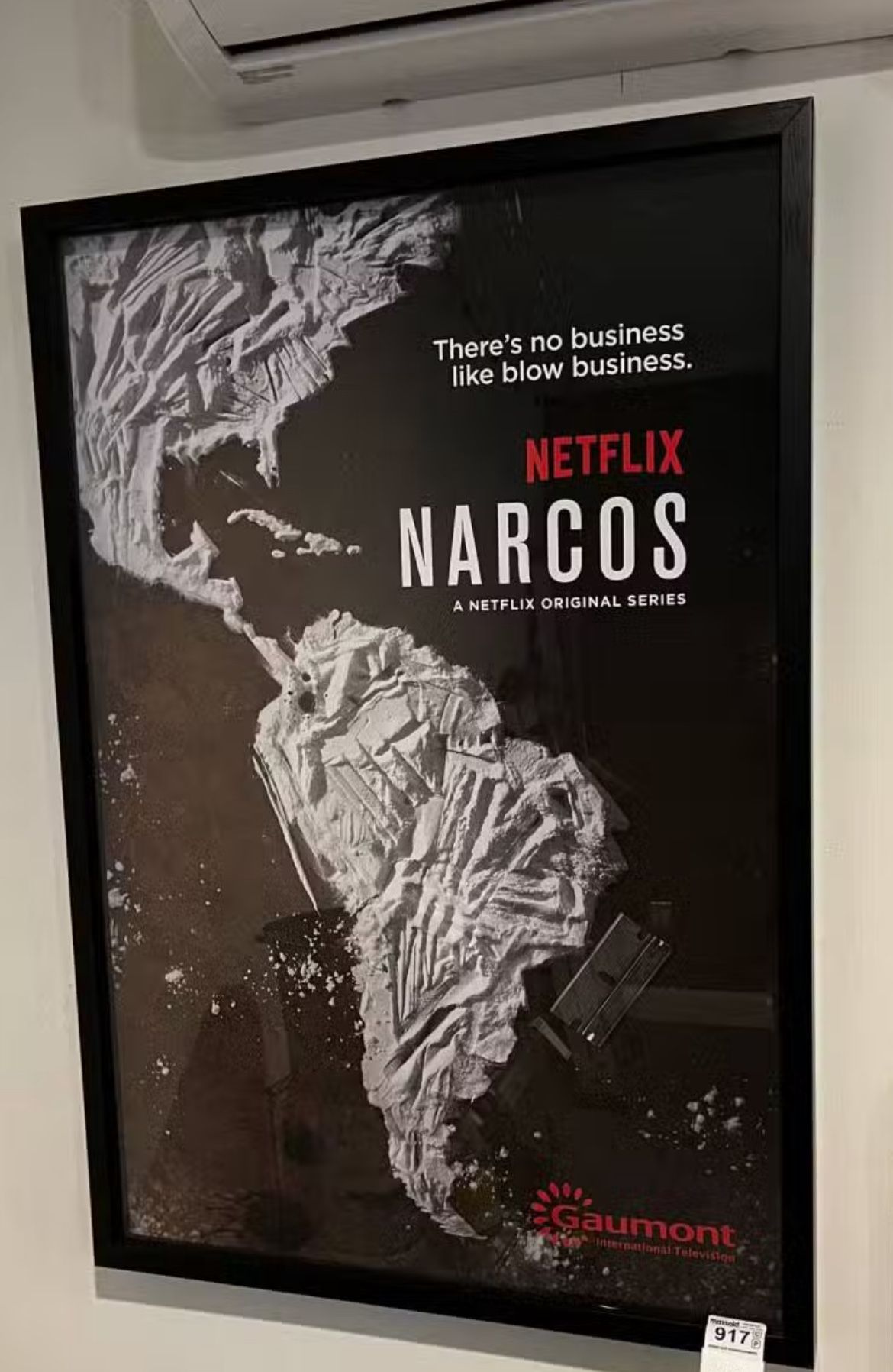 Original Netflix promotional poster for Narcos, professionally framed and ready to hang. Features the iconic cocaine-map graphic of Central and South America with the tagline “There’s no business like blow business.” Produced for Netflix / Gaumont International Television promotional use. This is not a theatrical movie poster, but an official marketing display piece from the original release period (circa 2015). Large-format, bold graphic — ideal for media rooms, offices, studios, or collectors of modern television memorabilia. Condition: Very good. Minor wear consistent with display. Frame presents cleanly. Includes: Framed poster only (as shown) Era: Circa 2015 Origin: Netflix / Gaumont