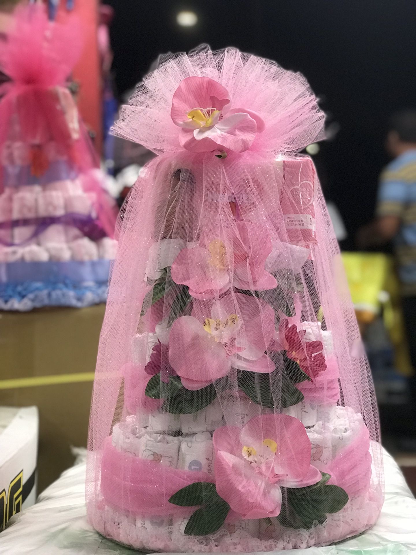 Pink flower diaper cake