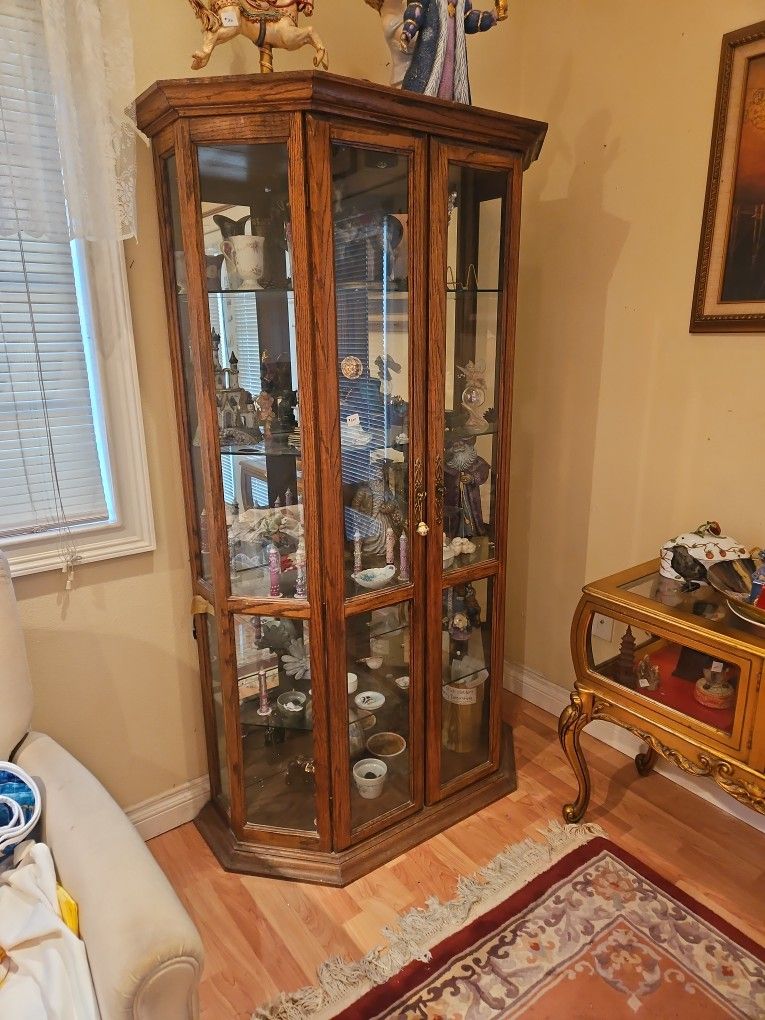 Double glass doors with angle sides, perfect for corner storage. Delicate hardware design with lively wood grains. 4 removable interior glass shelves.