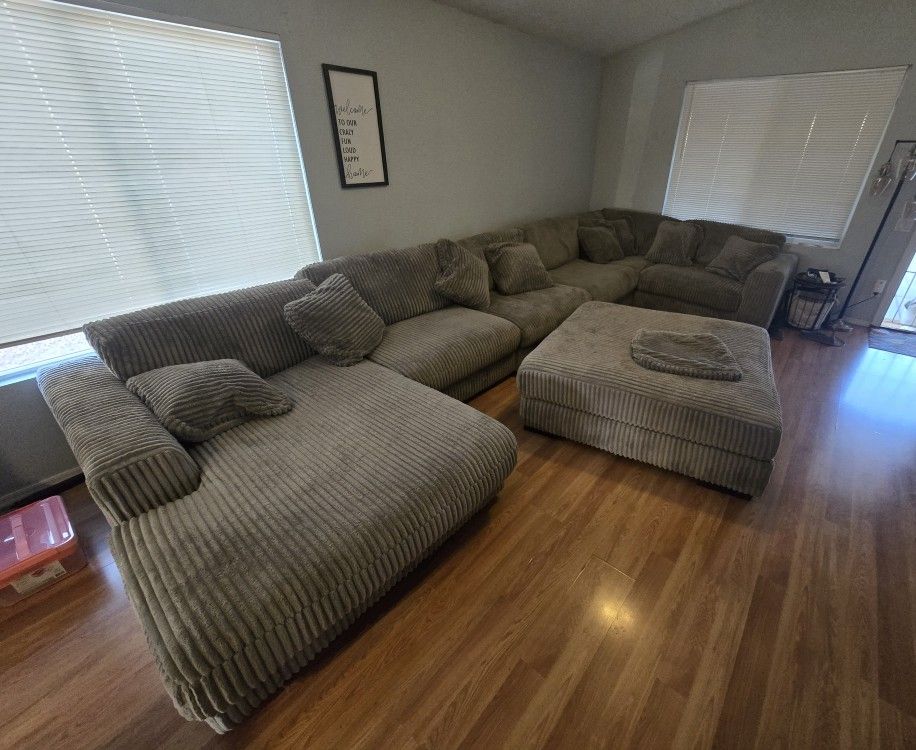 7 piece (includes oversized ottoman) 8 pillows + an extra pillow case (memory foam) 211" long 44" deep 75" deep chaise lounger Smoke free home