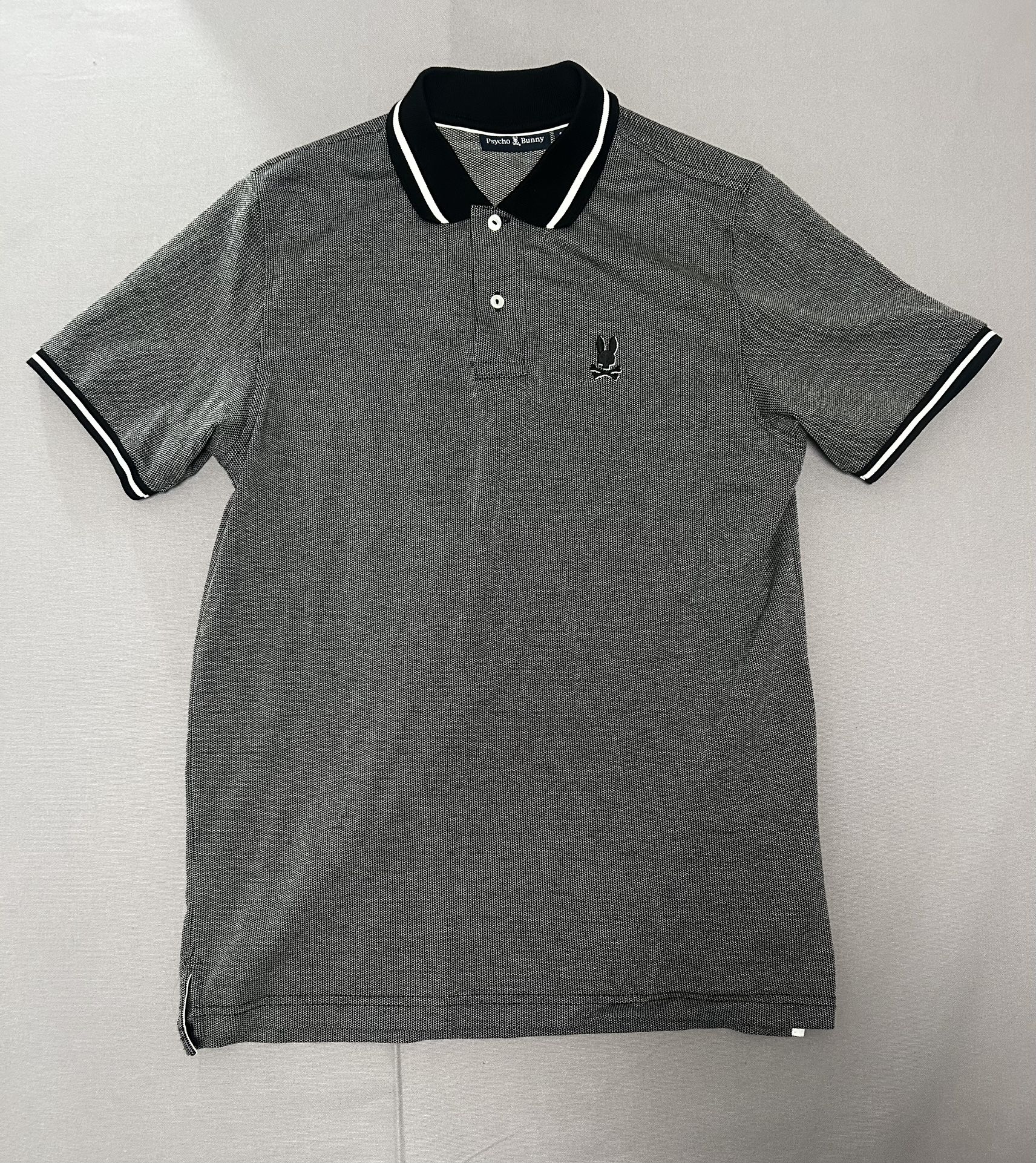 Men’s Psycho Bunny polo. Size Large (6). Gray with black tipped collar and logo on chest. 100% Pima cotton. Very clean. No flaws. Ready to wear.