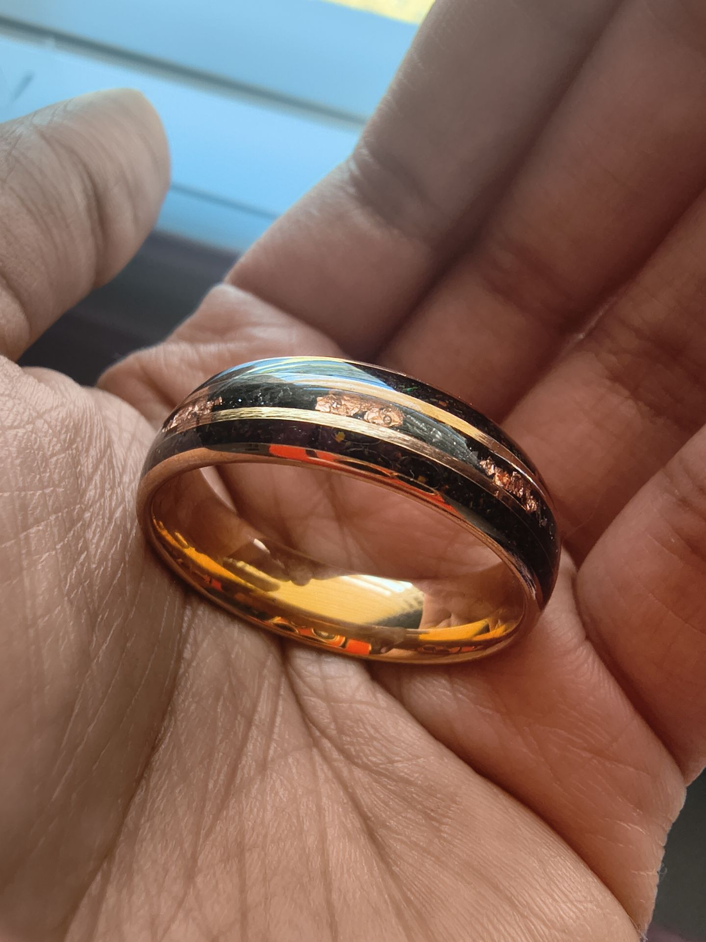 Handcrafted from rose gold tungsten carbide and inlaid with a beautiful meteorite and rose gold foil center. Fire opal in the details catches the sunlight beautifully. Fits ring size 11.