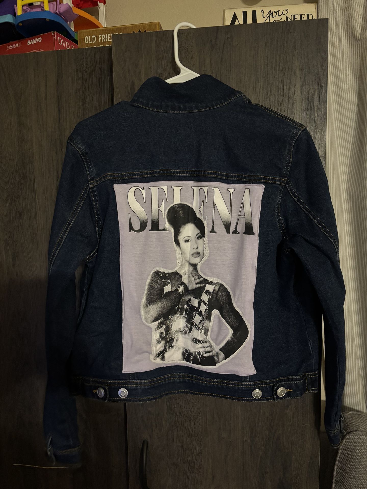 This item is a custom-designed denim jacket featuring a large graphic patch of the artist Selena Quintanilla made by hand by a friend. Asking for $60