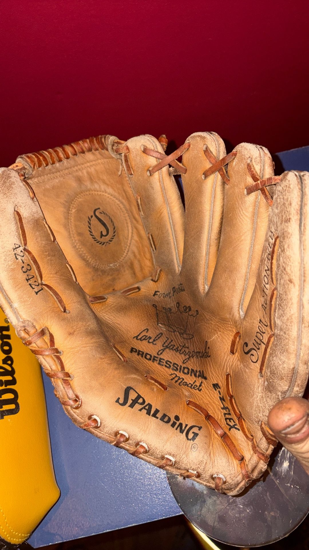 This is a vintage Spalding Carl Yastrzemski Professional Model (Model 42-3421) baseball glove. Based on the model number and the "Triple Crown" mentions often associated with this line, this glove likely dates back to the early 1970s (roughly 1971–1974). Key Features • Signature: It features the stamped signature of Boston Red Sox legend and Hall of Famer Carl "Yaz" Yastrzemski. • Model Specs: This is an 11-inch utility/fielder's glove featuring the "Super-Action Web" and "E-Z Flex" heel for easier closing. • Build: While this was a mass-produced "store model" (rather than a custom pro-issue glove Yaz actually used on the field), it was considered a high-quality consumer glove in its day. Wilson A2000 Glove Care Kit, specifically designed for repairing and maintaining high-end Pro Stock leather gloves. The A2000 pouch you showed previously is the carry case for this entire set. In your latest photos, we can see the core components used by professional clubhouse managers and serious players to keep their gloves in game-ready shape. What’s Inside Your Kit • Wilson Pro Stock Glove Oil: This is a high-quality conditioner (often mink oil-based) used to soften new leather and preserve older gloves without making them overly heavy. • Rawhide Lace: The tan coiled strips are replacement laces. These are essential for fixing broken fingers or tightening the web of a glove. • Lacing Needle / Tool: The long, thin metal rod is used to "sew" the new rawhide lace through the eyelets of the glove.