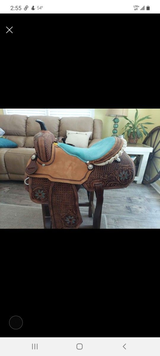 16" TEAL Western Saddle SET This saddle was custom made so it does not have a brand. New, never been on a horse Set Includes: 16" FQHB TEAL Saddle Matching TEAL Stirrups Matching Breast Plate Matching Headstall and Split Reins Copper Bit
