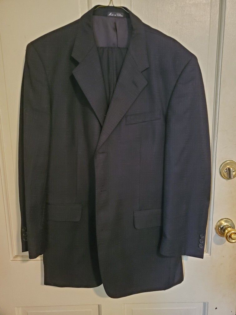 Black 2 piece, 3 button, double vent suit, coat 40reg, pants 34 waist.