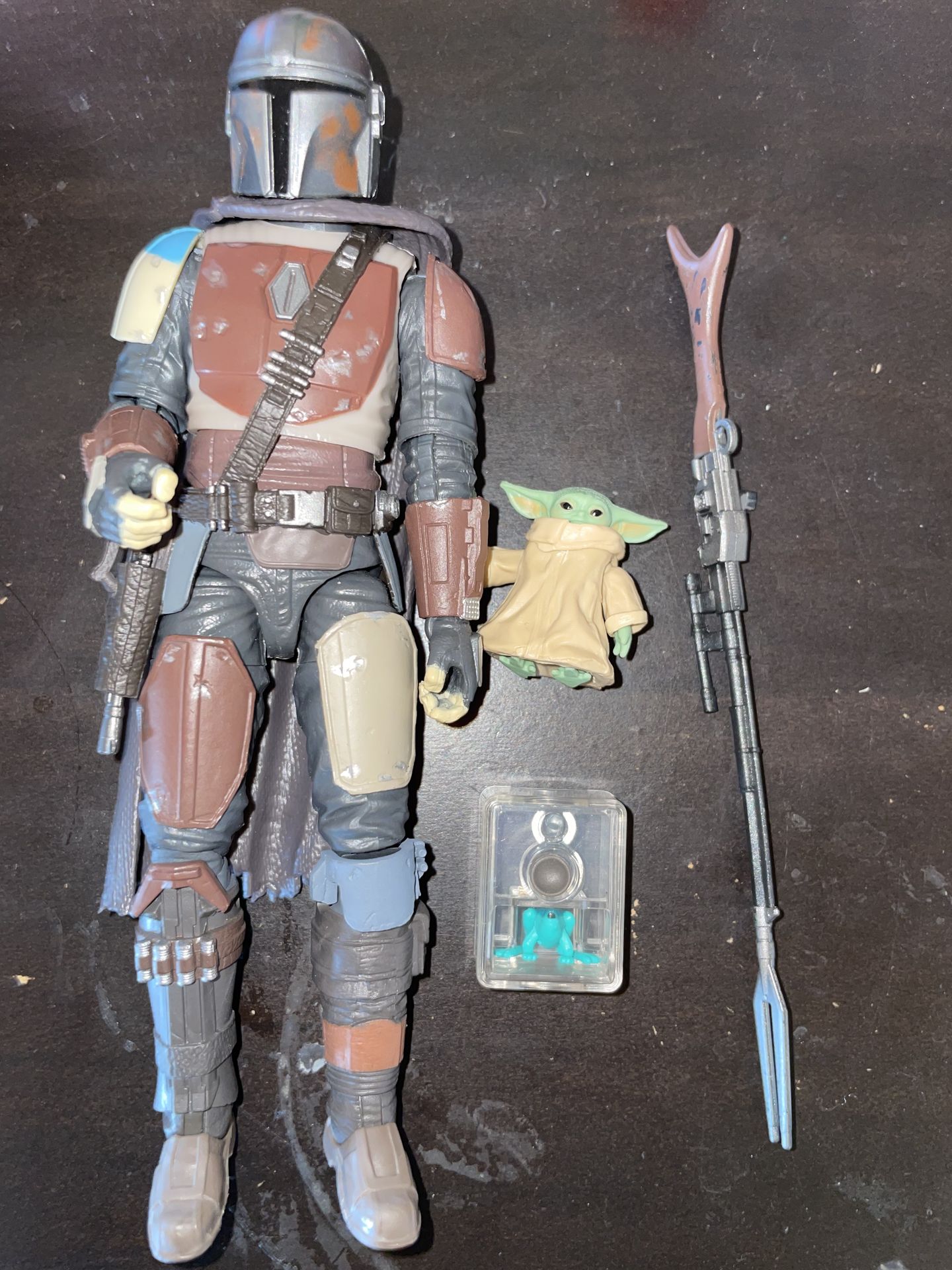 Mandalorian deluxe figure accessories included (2020 ) 6 inch figure The Mandalorian Figure: Features multiple points of articulation, a removable cape, and a holster for a sidearm / with side arm. -Grogu (The Child): A non-articulated or minimally articulated companion figure. -Amban Phase-pulse Blaster Rifle: Detailed with a distinctive two-pronged barrel and wood-grain stock. Accessories: The small clear case includes a tiny tracking fob or a similar prop used in the series.