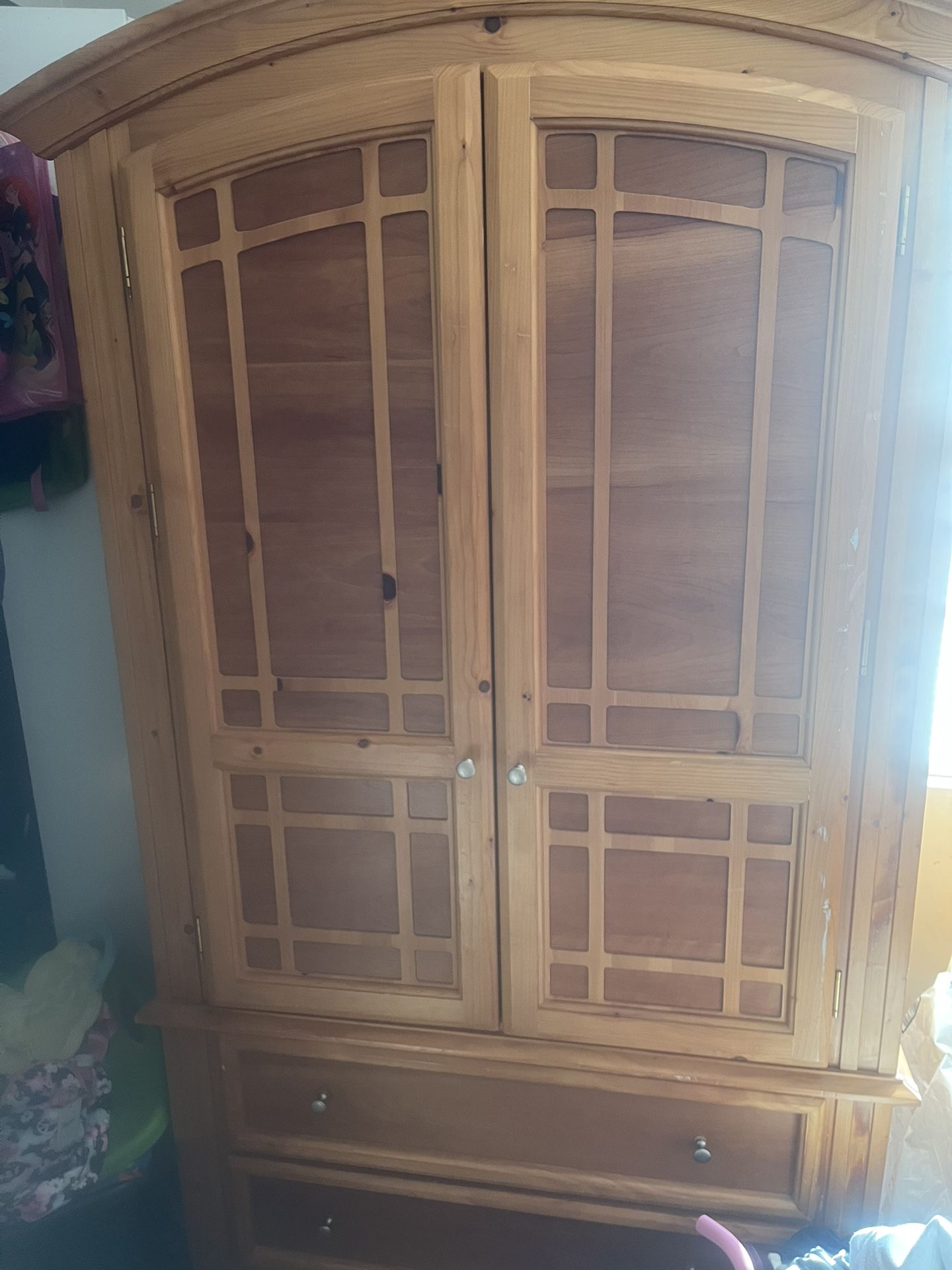 Wooden Bed set still in good condition. The dresser with the mirror on it has a few drawers off track. Queen size foam mattress included