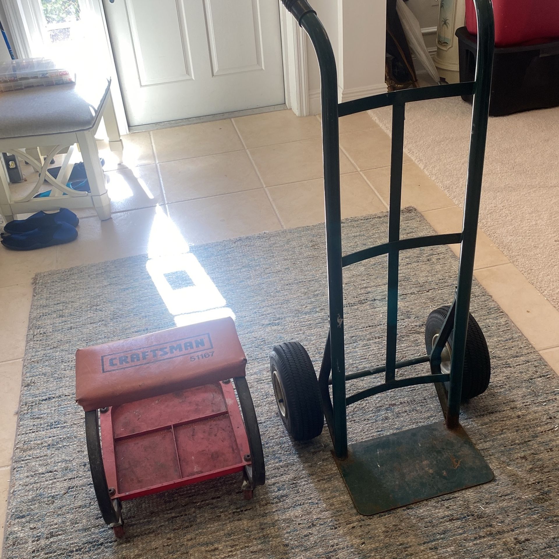 Here are 2 items you need Harper roll around 2 wheel Appliance furniture dolly.600 lb. Capacity $40–craftsman sit on 4 wheel tool roll around dolly-$20