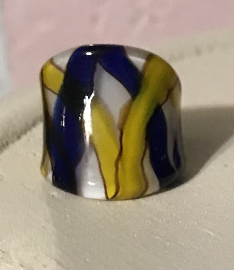 This is so pretty and very unique! Gorgeous, vivid colors make a wonderful statement and can’t help but be noticed. Smooth glass feels very comfortable on. About 1” wide. Perfect to wear anytime of the year.