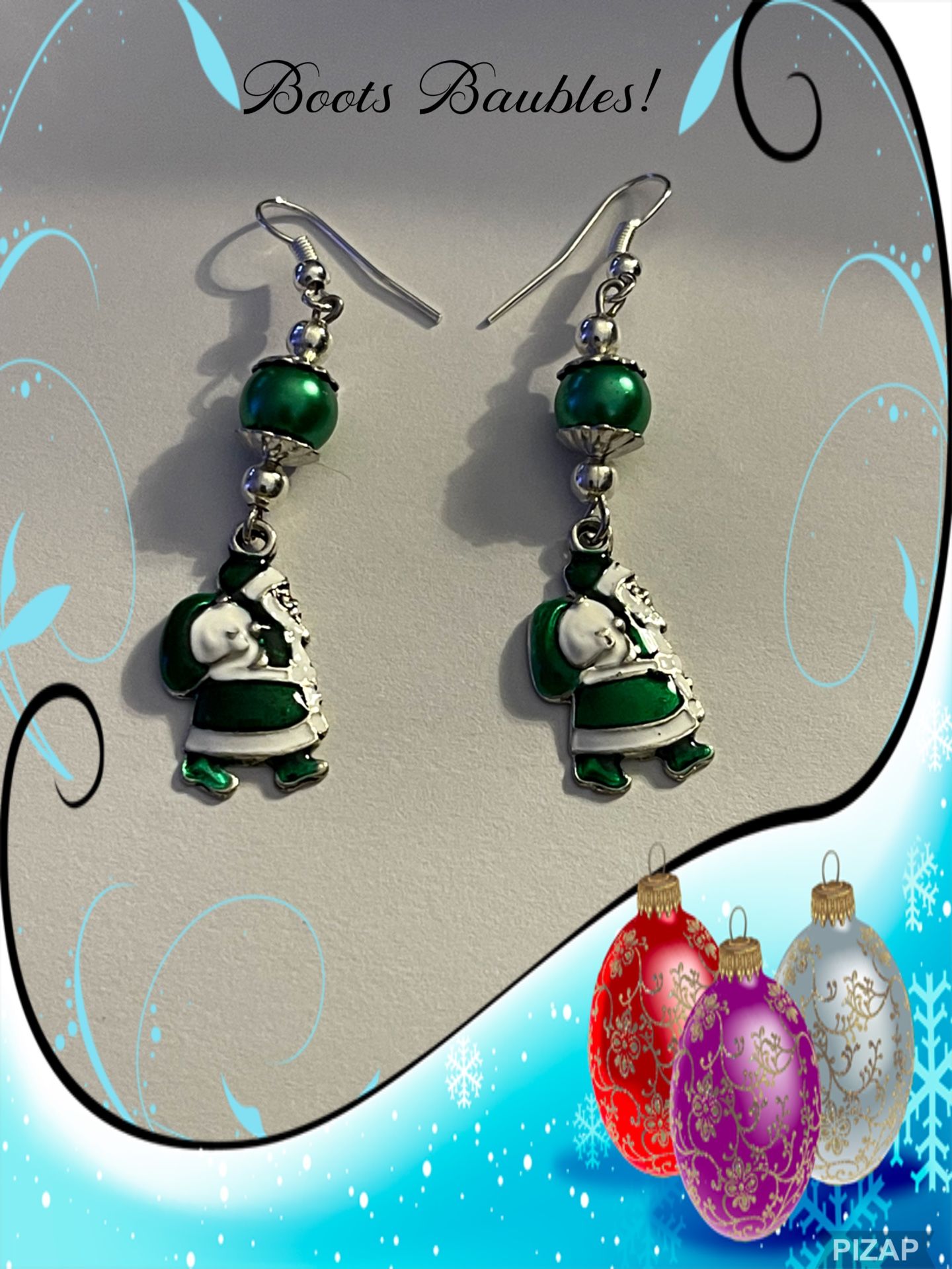 Handcrafted earrings made with green glass pearls, silver bead caps, and silver spacers with a cute and chubby green Santa. Get them before Santa does.
