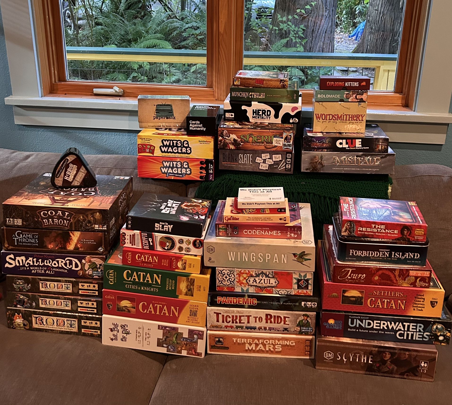Trying to thin out my collection a bit. Everything has complete components. If a game is listed under available, it is available, no need to ask. Pickup in LFP. Available: Trivial Pursuit: Horror Movie Edition (Very Good)— $2 or free with purchase of $25 or more Bold Made (NIS)– $3 or free with purchase of $25 or more Wits and Wagers (Good— has one pen replaced) – $5 Saturday Night Live The Game (NIS) – $5 Exploding Kittens (Good) – $8 Munchkin Cthulhu (Good) – $8 Herd Mentality (Components NIS, box has some superficial damage) – $10 Escape Room: Egypt Edition (New) – $10 Decrypto (Very Good) – $12 Wordsmithery (NIS) – $12 Blank Slate (Components NIS) – $15 A Game of Thrones Second Edition (Like New) – $15 Ticket to Ride (Very Good) – $20 Catan (Very Good, but missing insert to hold components) — $22 Mistfall: Kickstarter Edition (Box good, components Like New) – $35 Pending: Sold: Coal Baron Azul Scythe Cards Against Humanity Root Smallworld Codenames Tsuro Pandemic Uno Clue Catan (NIS) Catan 5-6 Player Expansion Bang! the Dice Game Root Clockwork Expansion Root Clockwork Expansion 2 We didn’t playtest this at all Wingspan Underwater Cities Terraforming Mars Here to Slay The Resistance Sheriff of Nottingham Forbidden Island Guillotine Ticket to Ride (NIS) Settlers of Catan Wits and Wagers: Party Edition The Isle of the Cats Exit: The Sunken Treasure Paperback Puzzle Sort & Go Catan Cities and Knights