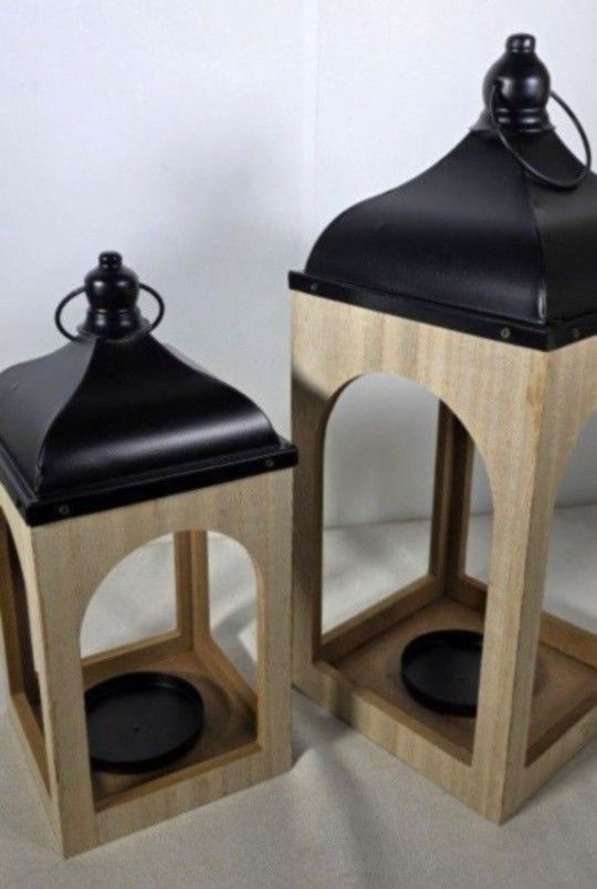 Two New Floor Or Counter Candle Holders. The candle holders are made of Wood and Metal. Could be used for Counter Decor, Outside Decor or Front Door Decor. Very Country Style Chic. New. Small - 10 x 4 Larger - 18 x 6