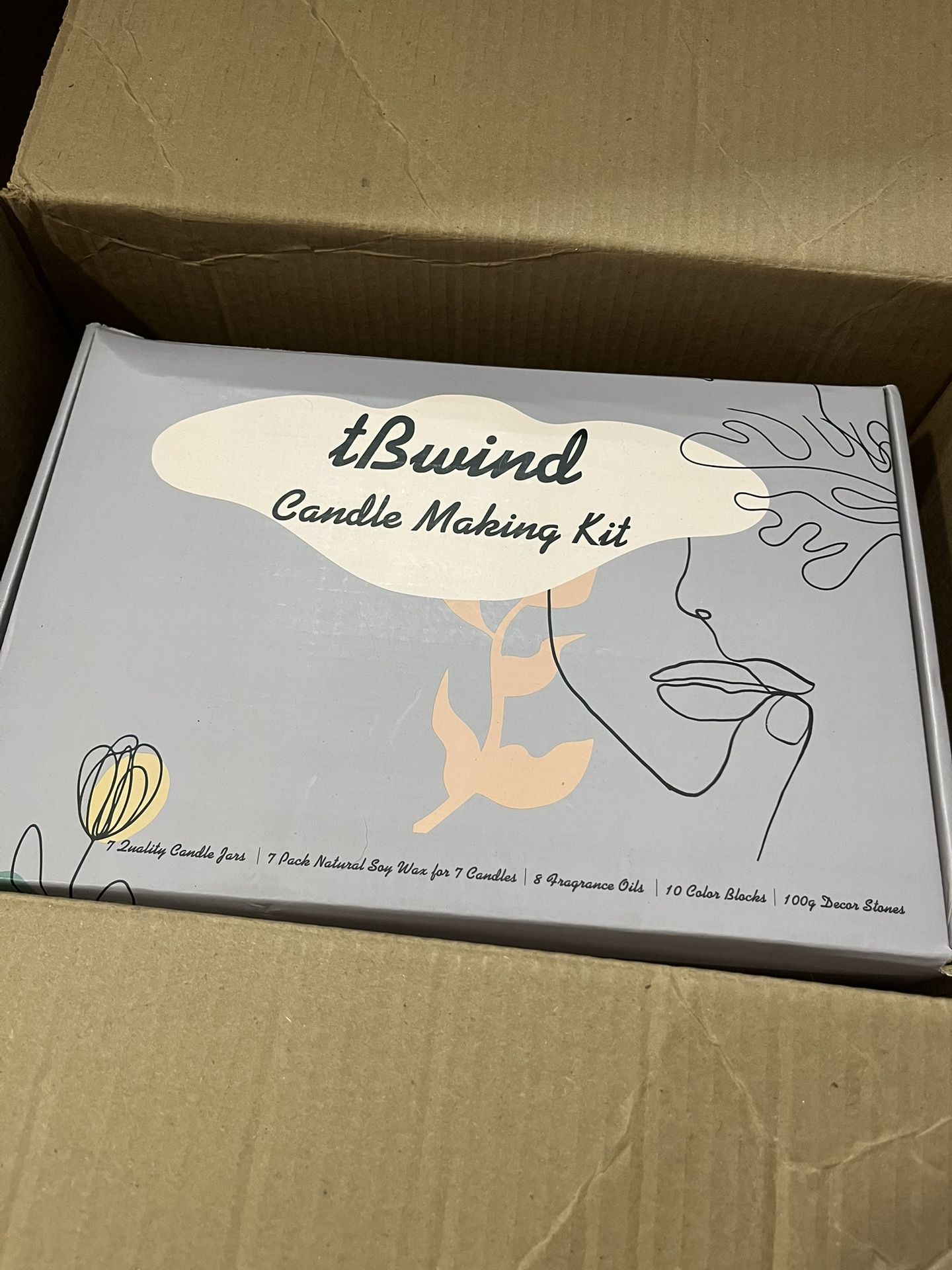 Comes with everything pictured 8 glass jars with lids 2 tins Stickers/labels Thank you boxes Essential oils 4 packs of Soy wax Measuring cup Thermometer Wicks Instructions