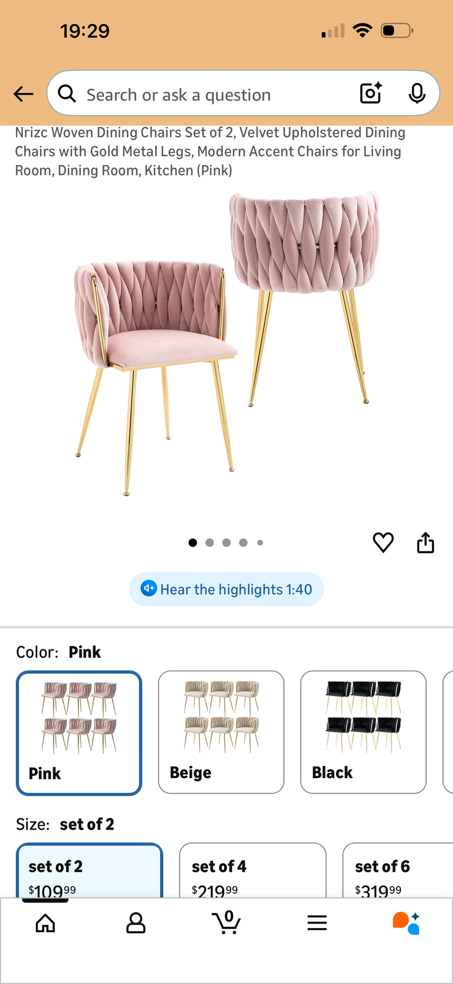 Nrizc Woven Dining Chairs Set of 2, Velvet Upholstered Dining Chairs with Gold Metal Legs, Modern Accent Chairs for Living Room, Dining Room, Kitchen (Pink) $50/2 chair