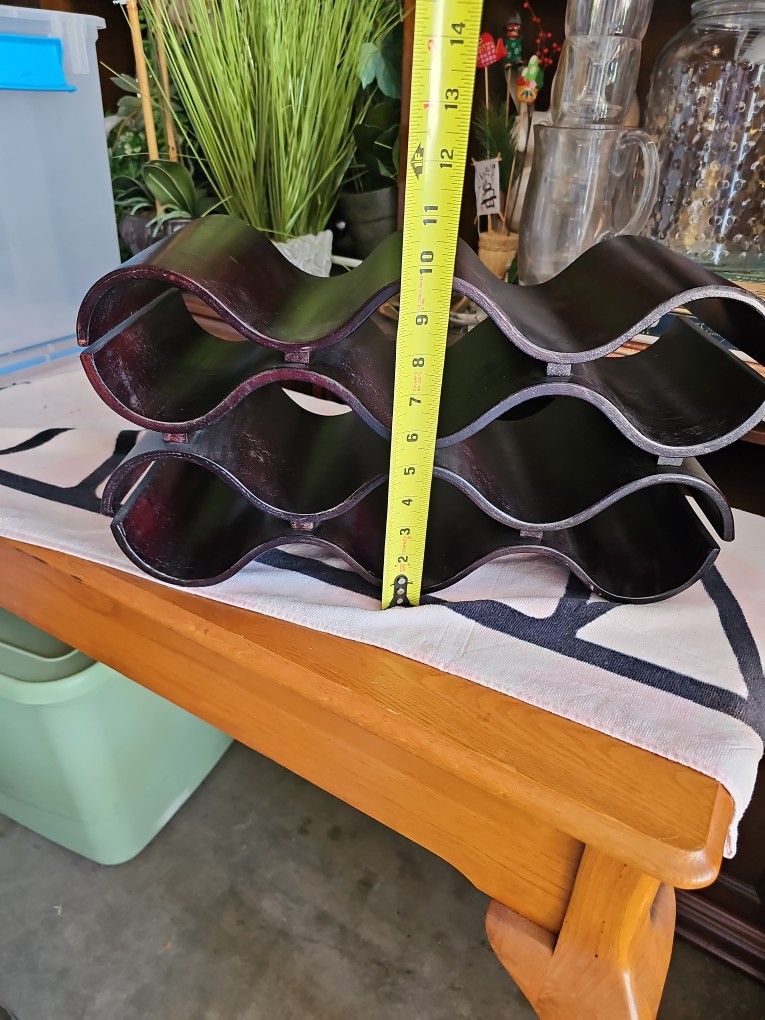 Great wine rack - dark wood. Very sturdy. Holds 10+ bottles. 9.5" tall x 17.5" wide. Great addition to your bar cart or kitchen nook. Excellent condition.
