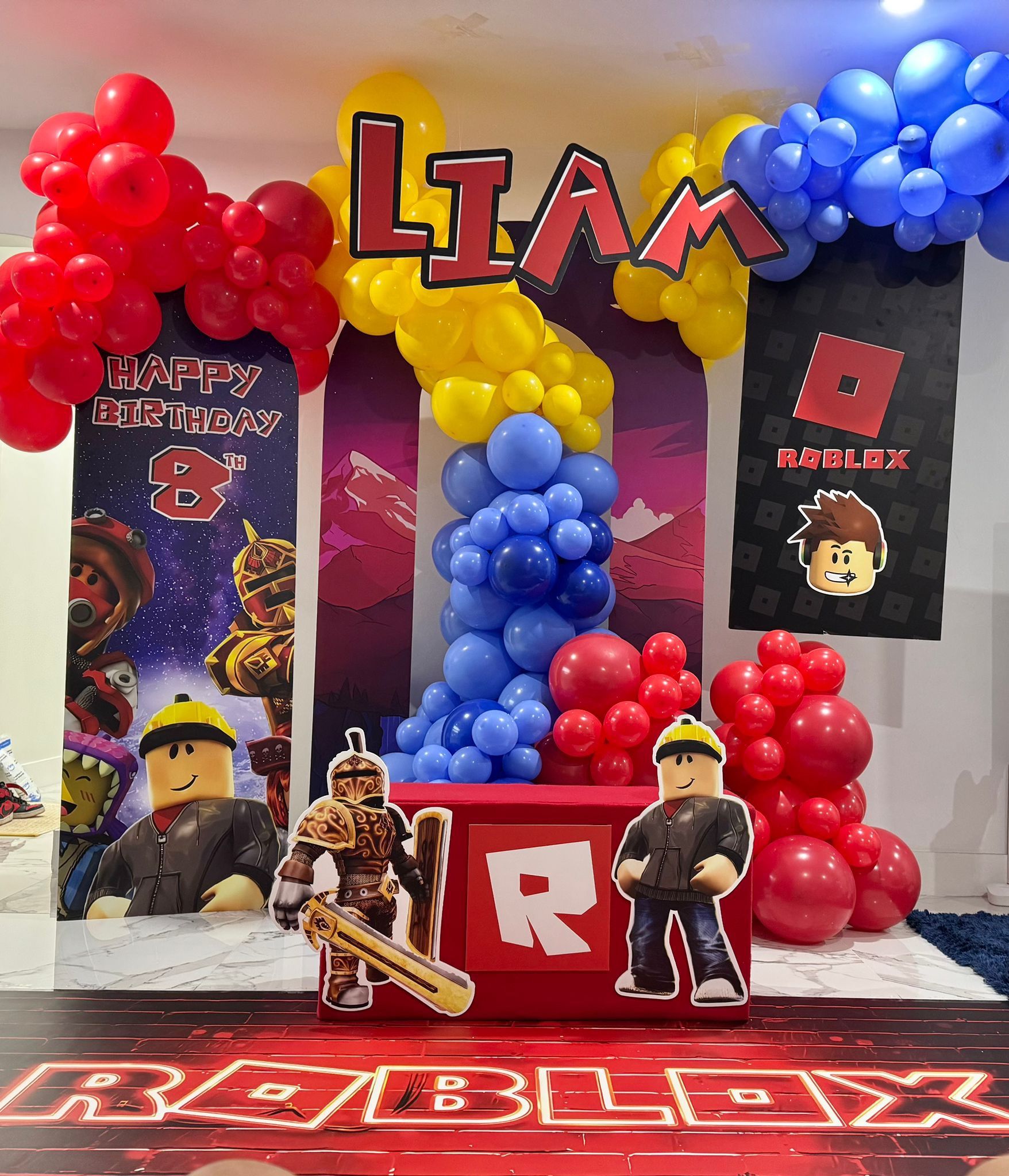 🎉 Roblox-Themed Birthday Party Decor – Perfect for Gamers! 🎮 Make your child’s special day unforgettable with this vibrant and action-packed Roblox-themed birthday setup, designed for fans of the popular game! Ideal for an 8th birthday party (or customizable for any age), this setup includes everything needed to bring the virtual world to life. ✅ What’s Included: • Name Banner (“Liam”) – • Balloon Arch Decor in bold red, blue, and yellow • Roblox Backdrop Banners featuring favorite characters and in-game graphics • 3D Character Cutouts – life-size Roblox avatars and warriors • Floor & Table Vinyl Wraps with the iconic Roblox logo • Photo-Ready Setup – perfect for capturing memories! 🎨 Bright, Bold & Fun – This decor is visually striking and totally immersive, ideal for kids who love building, battling, and exploring in Roblox.