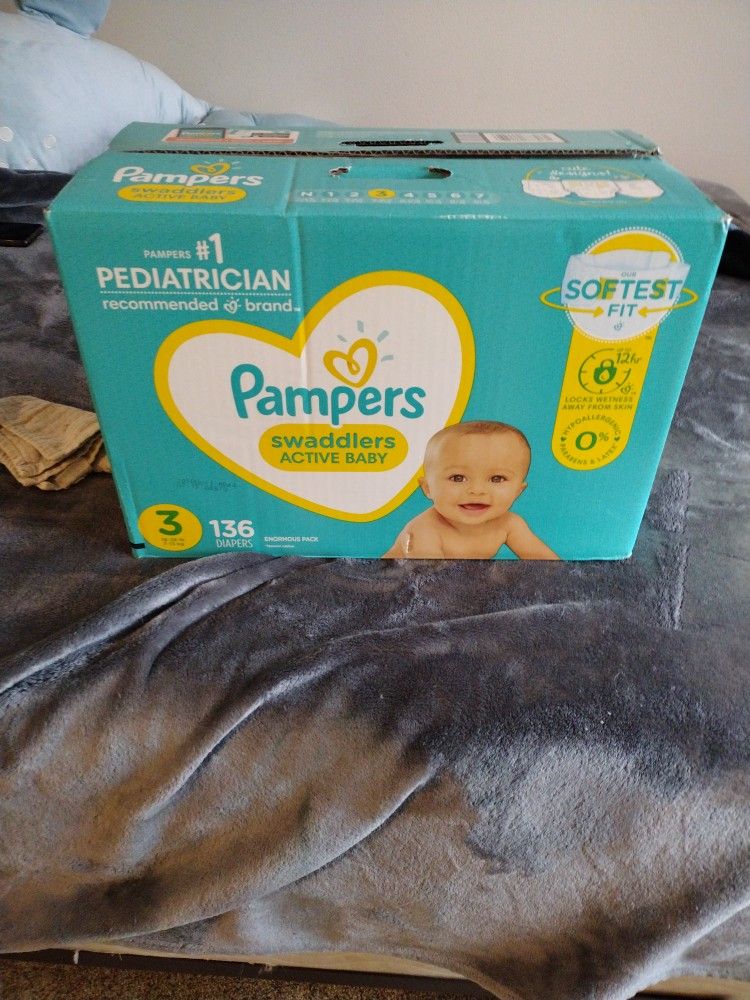 Pampers Swaddlers Size 3 136 count and Pampers Baby dry size 3 210 count 40$ Each or 75$ both. Received too many size 3 diapers and my son grew out of them.