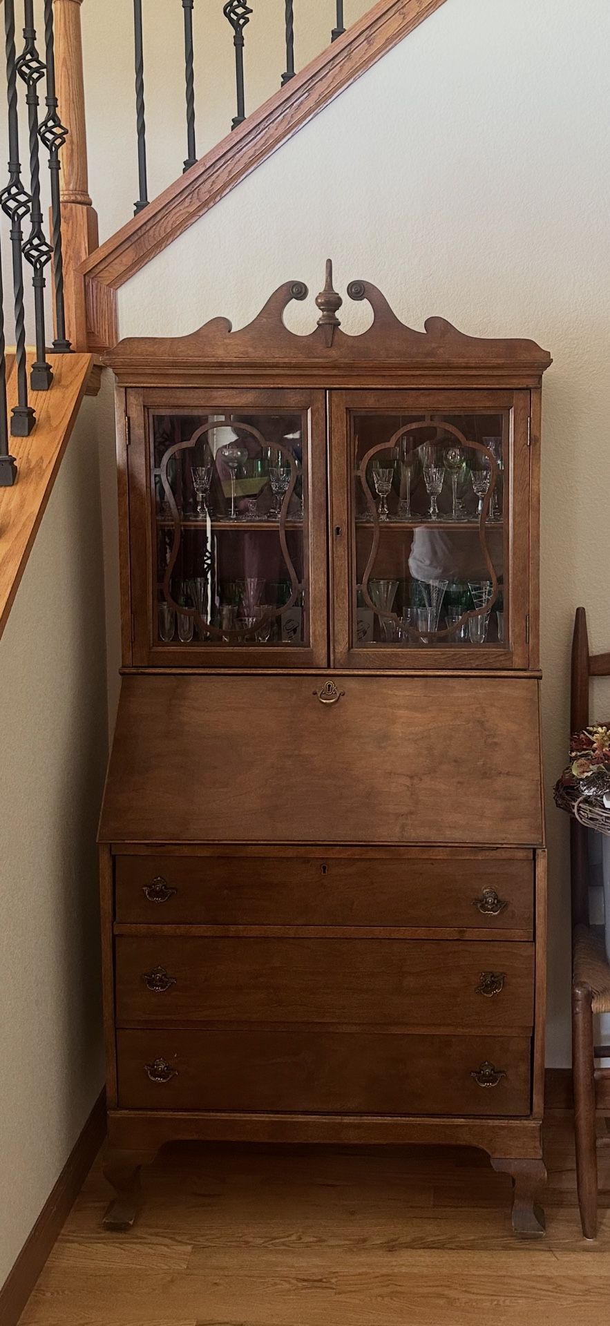 Antique secretary with broken leg (repairable with glue). In excellent condition. 15 in depth at widest point. 31 inches wide x 70 inches height