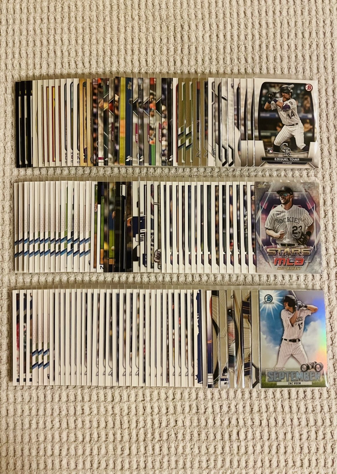 Colorado Rockies 120 Sports Card MLB Baseball Card Team Lot! All cards in mint condition! Rookies, prospects, All-Stars, inserts, parallels, variations & more! Mix of Topps & Panini. Bowman, Topps Chrome, Topps Finest, Select, Stadium Club, Stadium Club Chrome, Series 1, Series 2, Update Series, Gypsy Queen, Donruss, Donruss Optic, Prizm, Heritage, Opening Day, Mosaic & more! Kris Bryant, Charlie Blackmon, Ezequiel Tovar, Nolan Jones, Elias Diaz, Ryan McMahon, Elehuris Montero, Brendan Rodgers, Kyle Freeland, Austin Gomber, German Marquez, Ryan Feltner, Daniel Bard, Antonio Senzatela, Peter Lambert, Zac Veen & much more! $40 for the lot! Local pick up & shipping available. Message for details. Thank you!