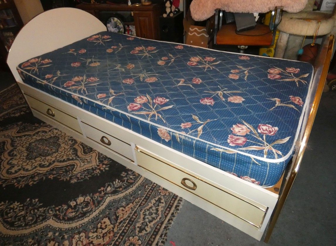 Twin size bed with drawers and mattress.