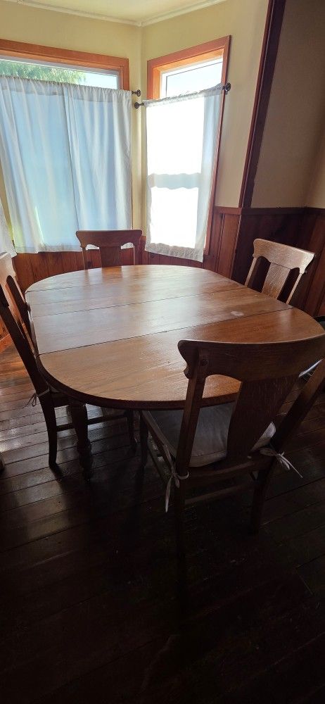 Solid oak expandable, drop leaf table (no leafs originally sold to me for center section). 4 "Tiger Oak" chairs that need to be reupolstered. Cushions in photos will be included. Width 45 Length 58
