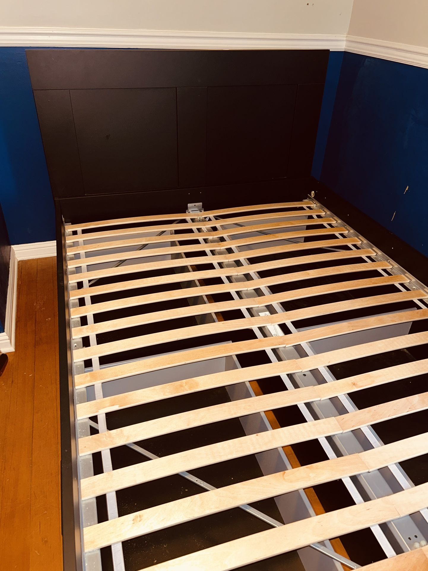 Features 4 large drawers underneath and a headboard with 3 integrated shelves on each side. BRIMNES model by IKEA